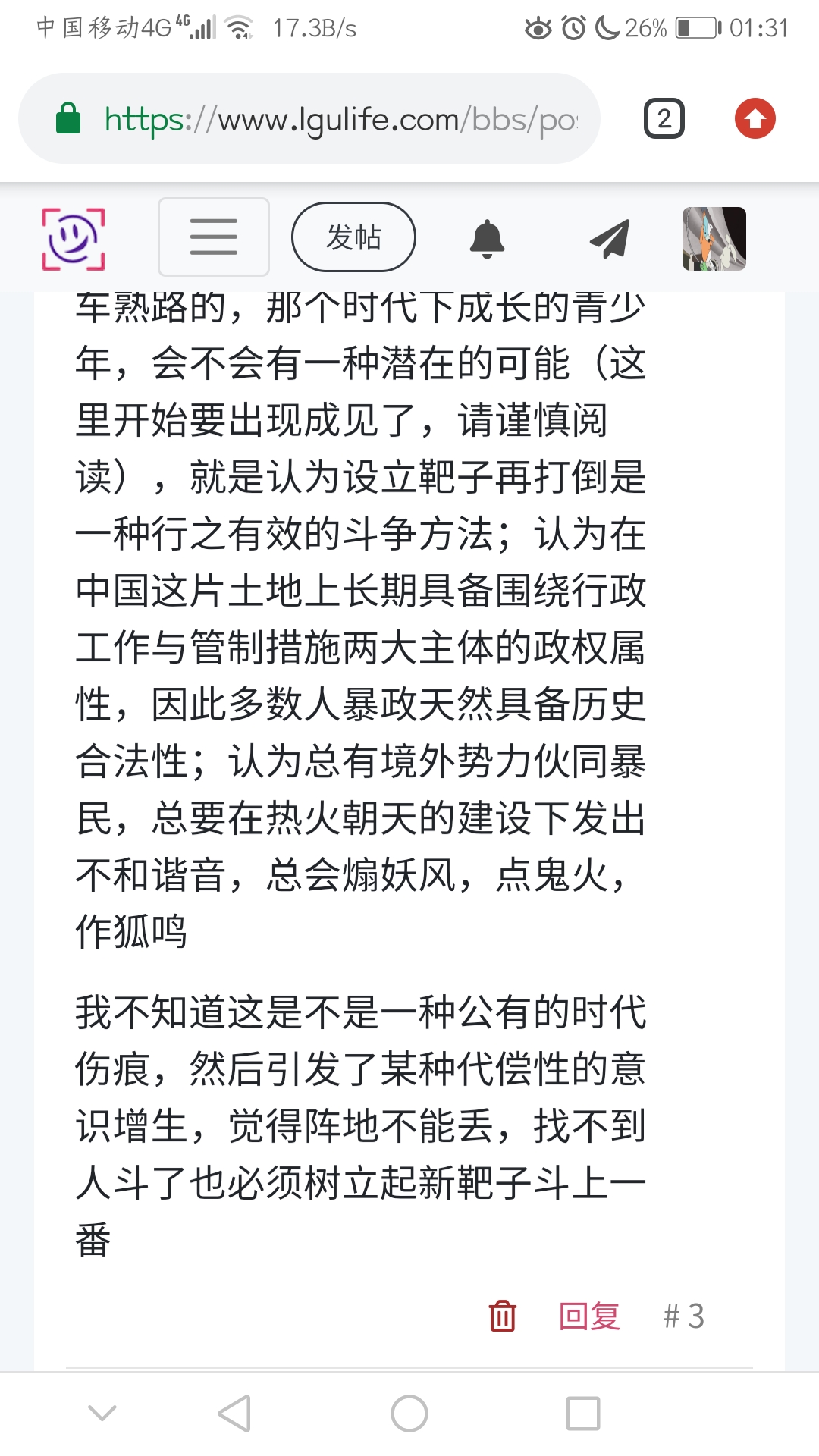 我们都知道,塑造一个靶子,再连人带靶子靶子打倒这种操作,在50-60年前大家可以说是兴致勃勃,轻车熟路的,那个时代下成长的青少年,会不会有一种潜在的可能(这里开始要出现成见了,请谨慎阅读),就是认为设立靶子再打倒是一种行之有效的斗争方法;认为在中国这片土地上长期具备围绕行政工作与管制措施两大主体的政权属性,因此多数人暴政天然具备历史合法性;认为总有境外势力伙同暴民,总要在热火朝天的建设下发出不和谐音,总会煽妖风,点鬼火,作狐鸣