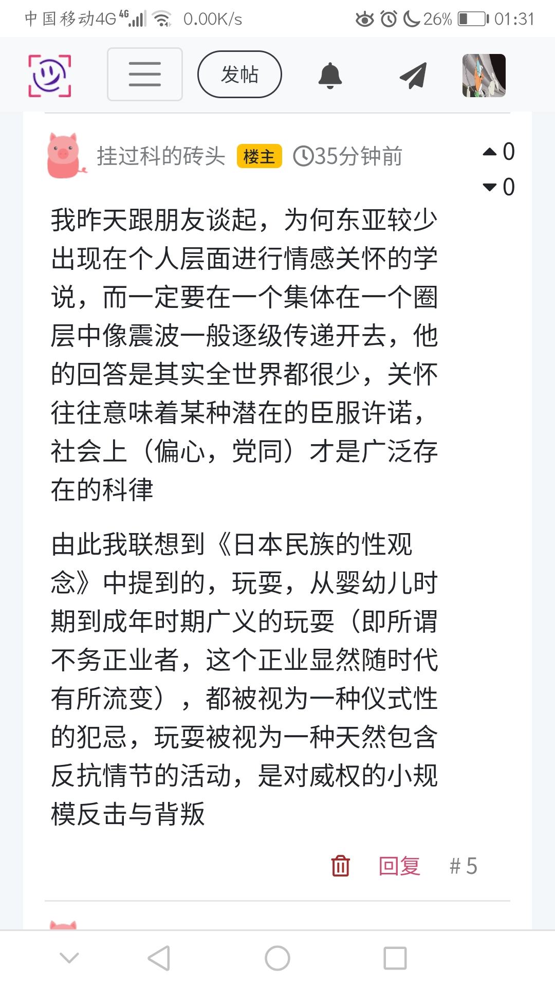 由此我联想到《日本民族的性观念》中提到的,玩耍,从婴幼儿时期到成年时期广义的玩耍(即所谓不务正业者,这个正业显然随时代有所流变),都被视为一种仪式性的犯忌,玩耍被视为一种天然包含反抗情节的活动,是对威权的小规模反击与背叛