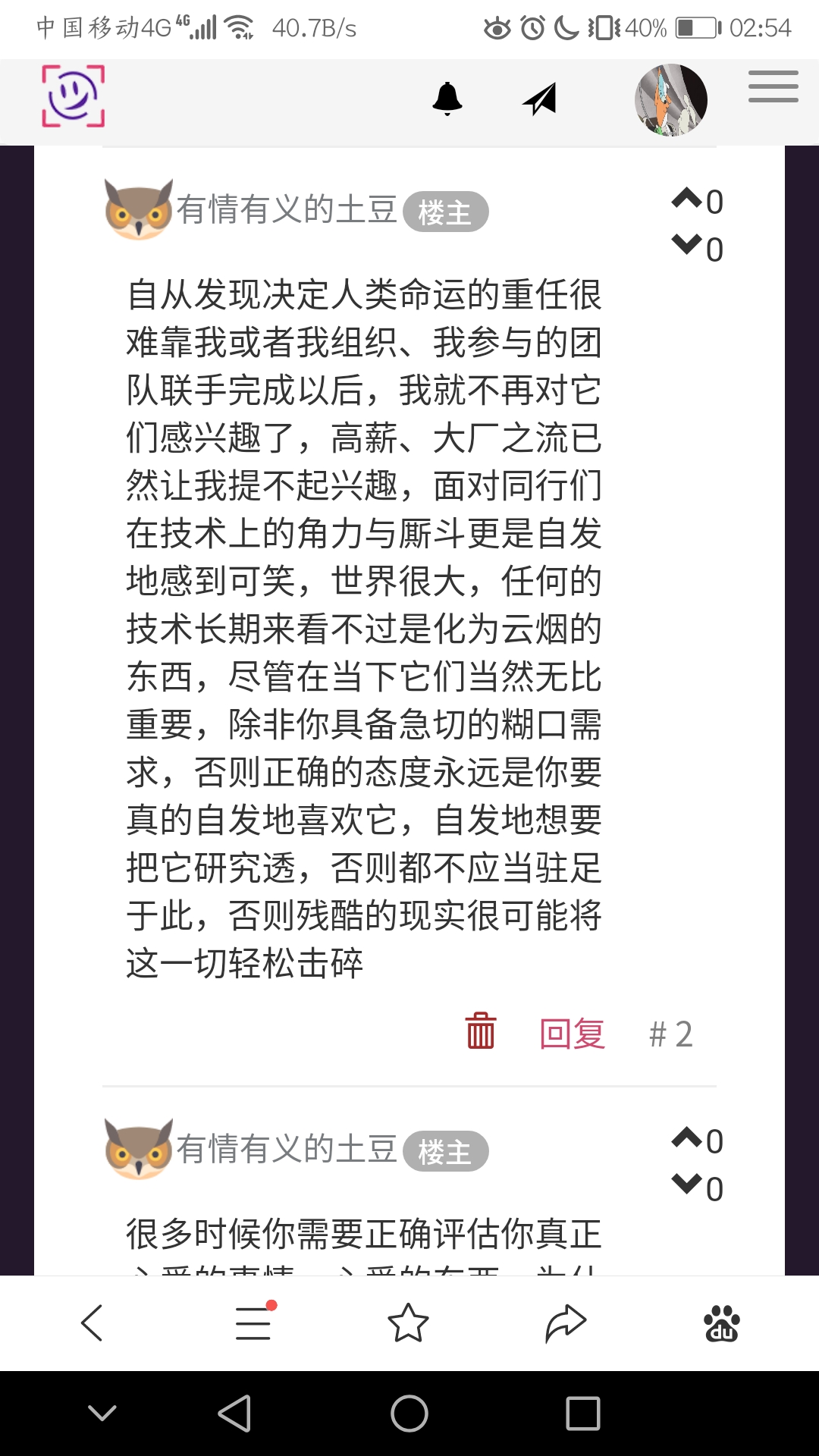 自从发现决定人类命运的重任很难靠我或者我组织、我参与的团队联手完成以后,我就不再对它们感兴趣了,高薪、大厂之流已然让我提不起兴趣,面对同行们在技术上的角力与厮斗更是自发地感到可笑,世界很大,任何的技术长期来看不过是化为云烟的东西,尽管在当下它们当然无比重要,除非你具备急切的糊口需求,否则正确的态度永远是你要真的自发地喜欢它,自发地想要把它研究透,否则都不应当驻足于此,否则残酷的现实很可能将这一切轻松击碎
