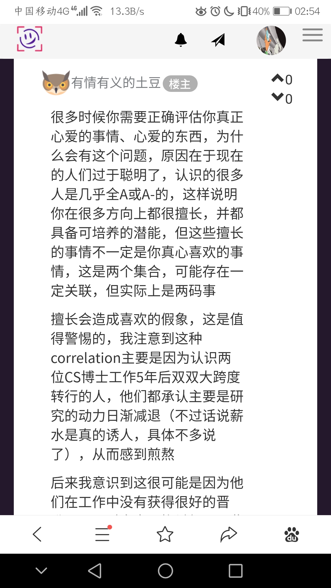 后来我意识到这很可能是因为他们在工作中没有获得很好的晋升,从而对自身不抱希望,因此动力衰减,很多人说他们的退却是因为逆商太低,但我觉得,很可能仅仅是因为not that into it,这样在你顺风顺水的时段自然会喜欢这份工作,而当你流年不利的关头却可能成为压垮你的稻草,说白了,只是因为发展足够顺利,擅长和爱好中间发生的矛盾冲突被隐藏起来了,仅此而已