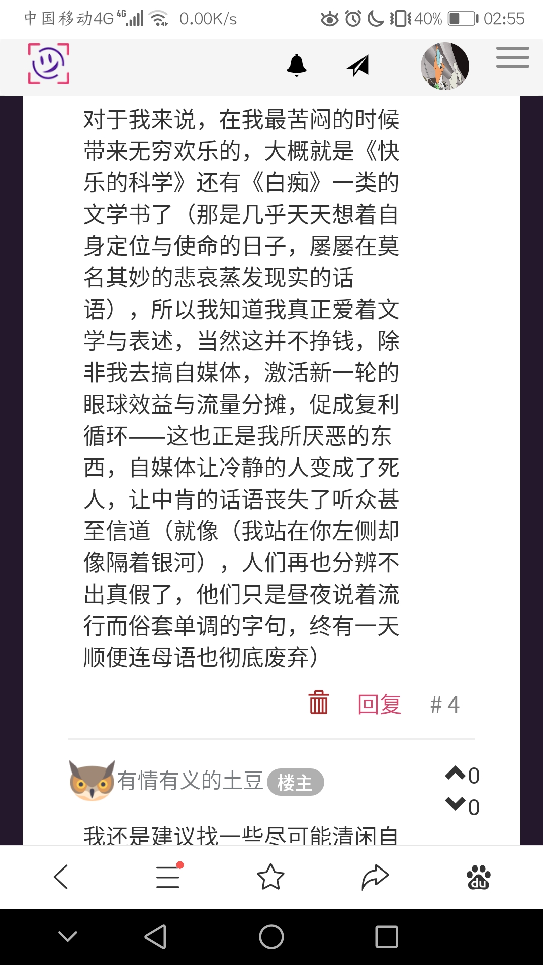 对于我来说,在我最苦闷的时候带来无穷欢乐的,大概就是《快乐的科学》还有《白痴》一类的文学书了(那是几乎天天想着自身定位与使命的日子,屡屡在莫名其妙的悲哀蒸发现实的话语),所以我知道我真正爱着文学与表述,当然这并不挣钱,除非我去搞自媒体,激活新一轮的眼球效益与流量分摊,促成复利循环——这也正是我所厌恶的东西,自媒体让冷静的人变成了死人,让中肯的话语丧失了听众甚至信道(就像(我站在你左侧却像隔着银河),人们再也分辨不出真假了,他们只是昼夜说着流行而俗套单调的字句,终有一天顺便连母语也彻底废弃)
