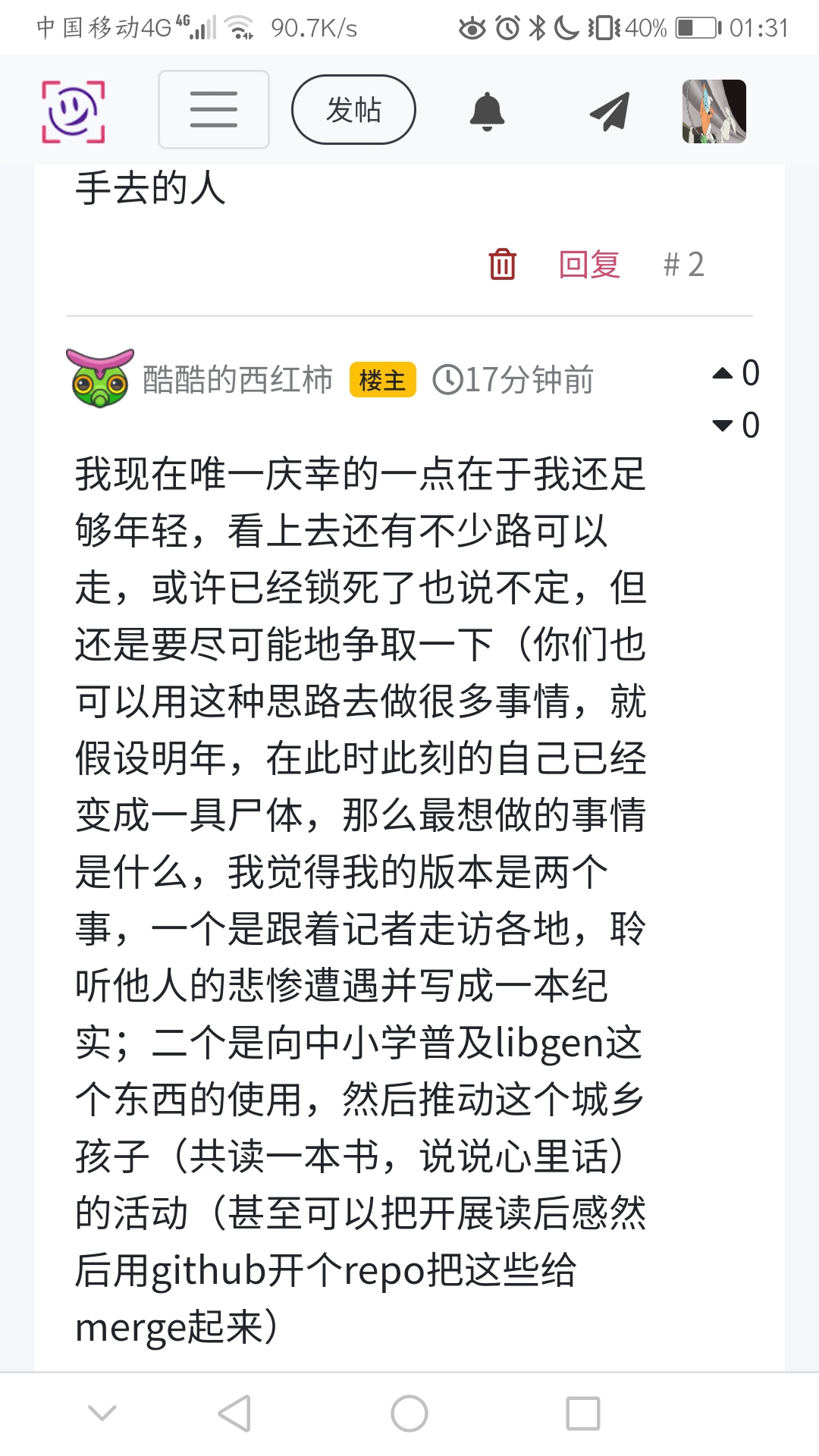 我现在唯一庆幸的一点在于我还足够年轻,看上去还有不少路可以走,或许已经锁死了也说不定,但还是要尽可能地争取一下(你们也可以用这种思路去做很多事情,就假设明年,在此时此刻的自己已经变成一具尸体,那么最想做的事情是什么,我觉得我的版本是两个事,一个是跟着记者走访各地,聆听他人的悲惨遭遇并写成一本纪实;二个是向中小学普及libgen这个东西的使用,然后推动这个城乡孩子(共读一本书,说说心里话)的活动(甚至可以把开展读后感然后用github开个repo把这些给merge起来)