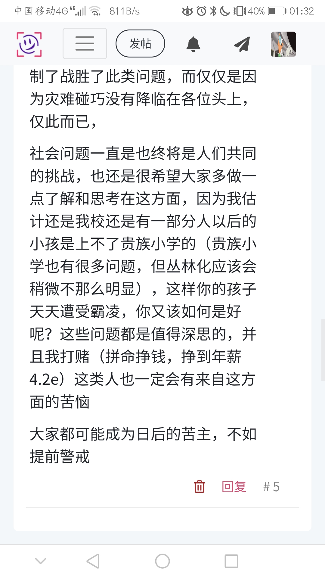 社会问题一直是也终将是人们共同的挑战,也还是很希望大家多做一点了解和思考在这方面,因为我估计还是我校还是有一部分人以后的小孩是上不了贵族小学的(贵族小学也有很多问题,但丛林化应该会稍微不那么明显),这样你的孩子天天遭受霸凌,你又该如何是好呢?这些问题都是值得深思的,并且我打赌(拼命挣钱,挣到年薪4.2e)这类人也一定会有来自这方面的苦恼