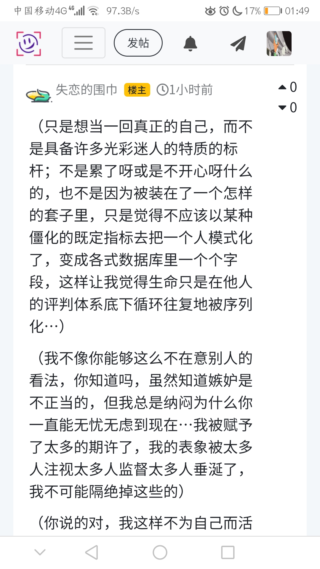 (只是想当一回真正的自己,而不是具备许多光彩迷人的特质的标杆;不是累了呀或是不开心呀什么的,也不是因为被装在了一个怎样的套子里,只是觉得不应该以某种僵化的既定指标去把一个人模式化了,变成各式数据库里一个个字段,这样让我觉得生命只是在他人的评判体系底下循环往复地被序列化…)
