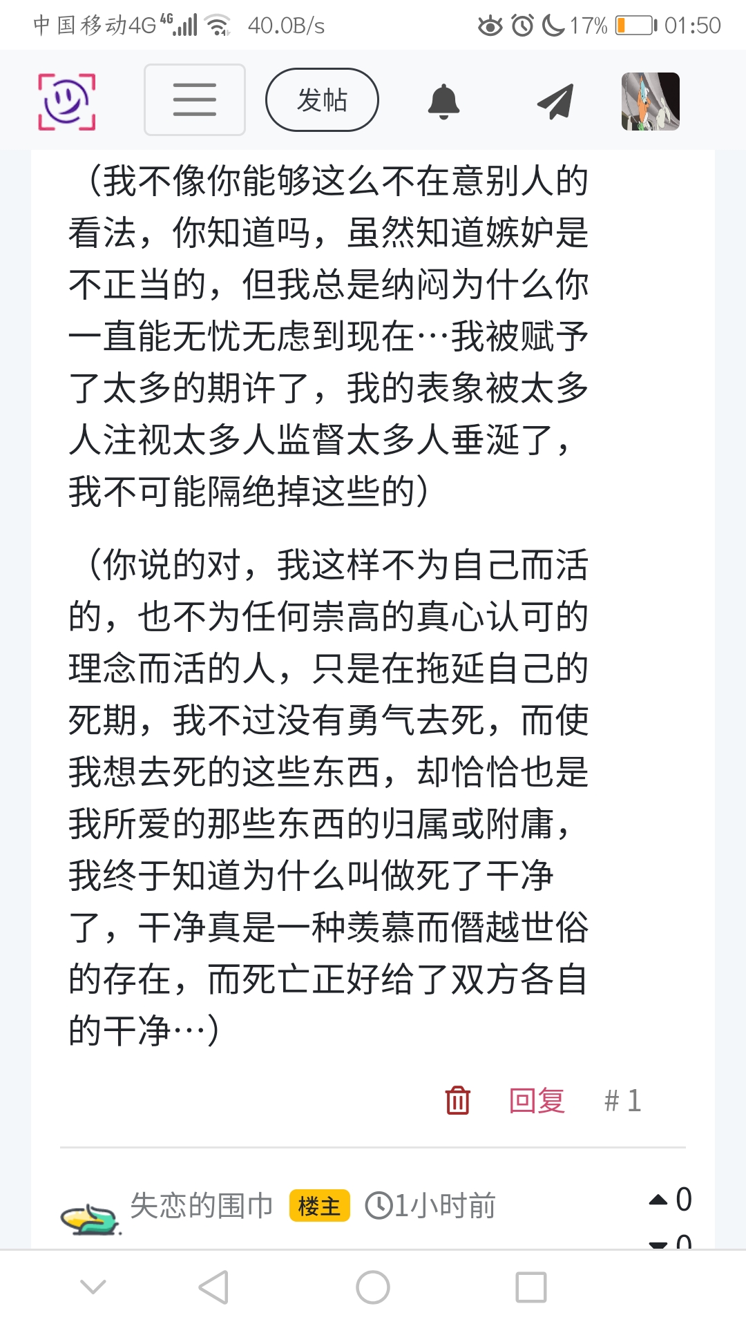 (你说的对,我这样不为自己而活的,也不为任何崇高的真心认可的理念而活的人,只是在拖延自己的死期,我不过没有勇气去死,而使我想去死的这些东西,却恰恰也是我所爱的那些东西的归属或附庸,我终于知道为什么叫做死了干净了,干净真是一种羡慕而僭越世俗的存在,而死亡正好给了双方各自的干净…)