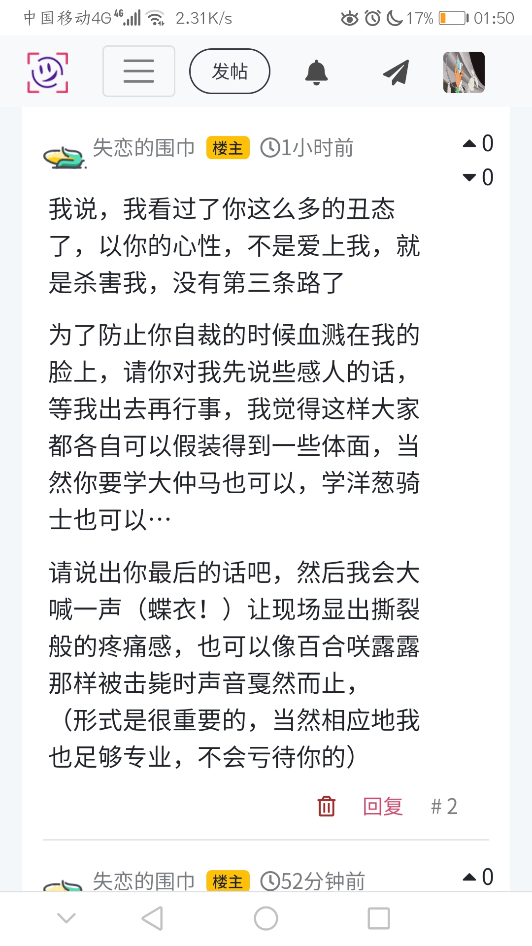 为了防止你自裁的时候血溅在我的脸上,请你对我先说些感人的话,等我出去再行事,我觉得这样大家都各自可以假装得到一些体面,当然你要学大仲马也可以,学洋葱骑士也可以…