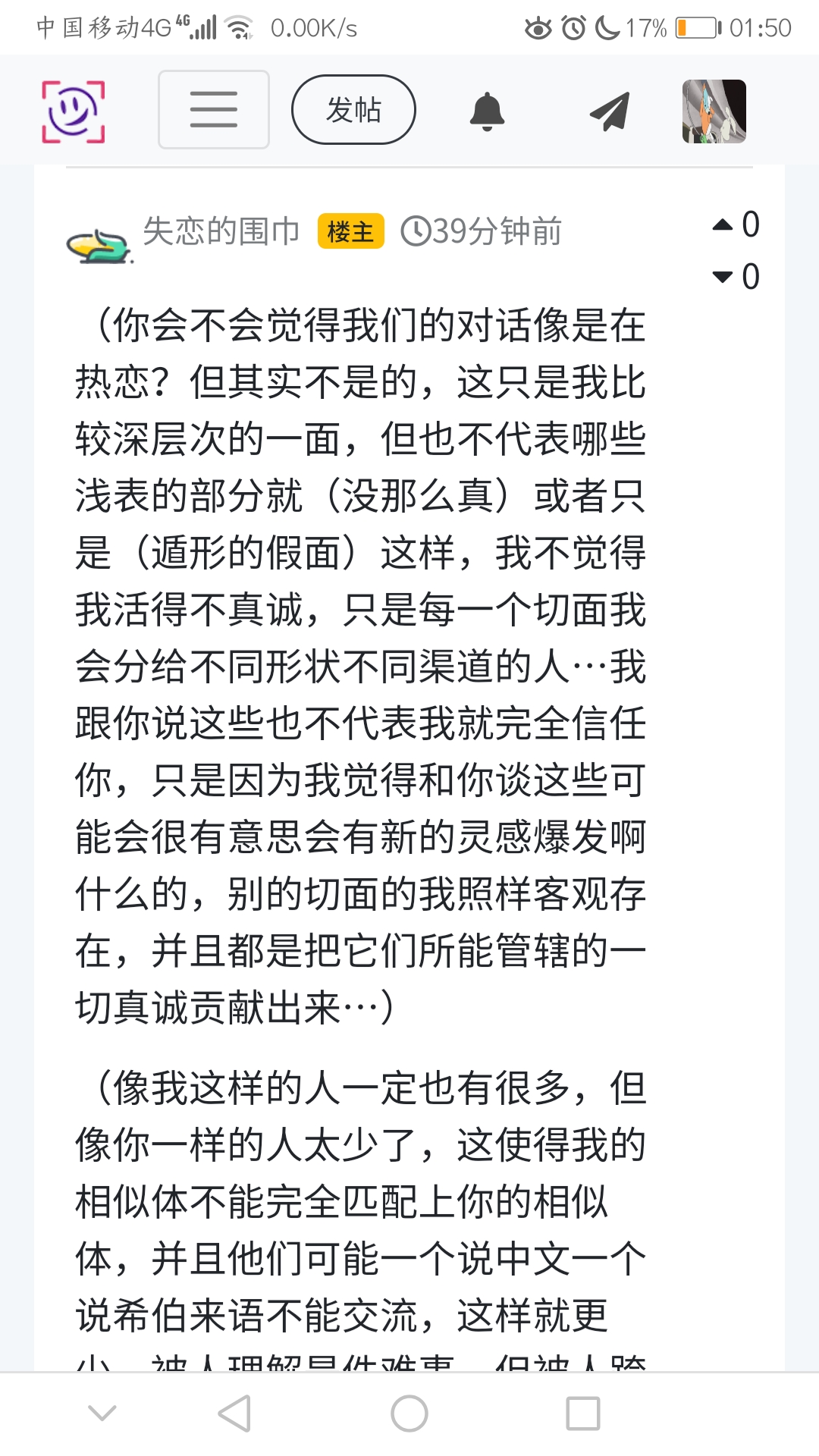 (你会不会觉得我们的对话像是在热恋?但其实不是的,这只是我比较深层次的一面,但也不代表哪些浅表的部分就(没那么真)或者只是(遁形的假面)这样,我不觉得我活得不真诚,只是每一个切面我会分给不同形状不同渠道的人…我跟你说这些也不代表我就完全信任你,只是因为我觉得和你谈这些可能会很有意思会有新的灵感爆发啊什么的,别的切面的我照样客观存在,并且都是把它们所能管辖的一切真诚贡献出来…)