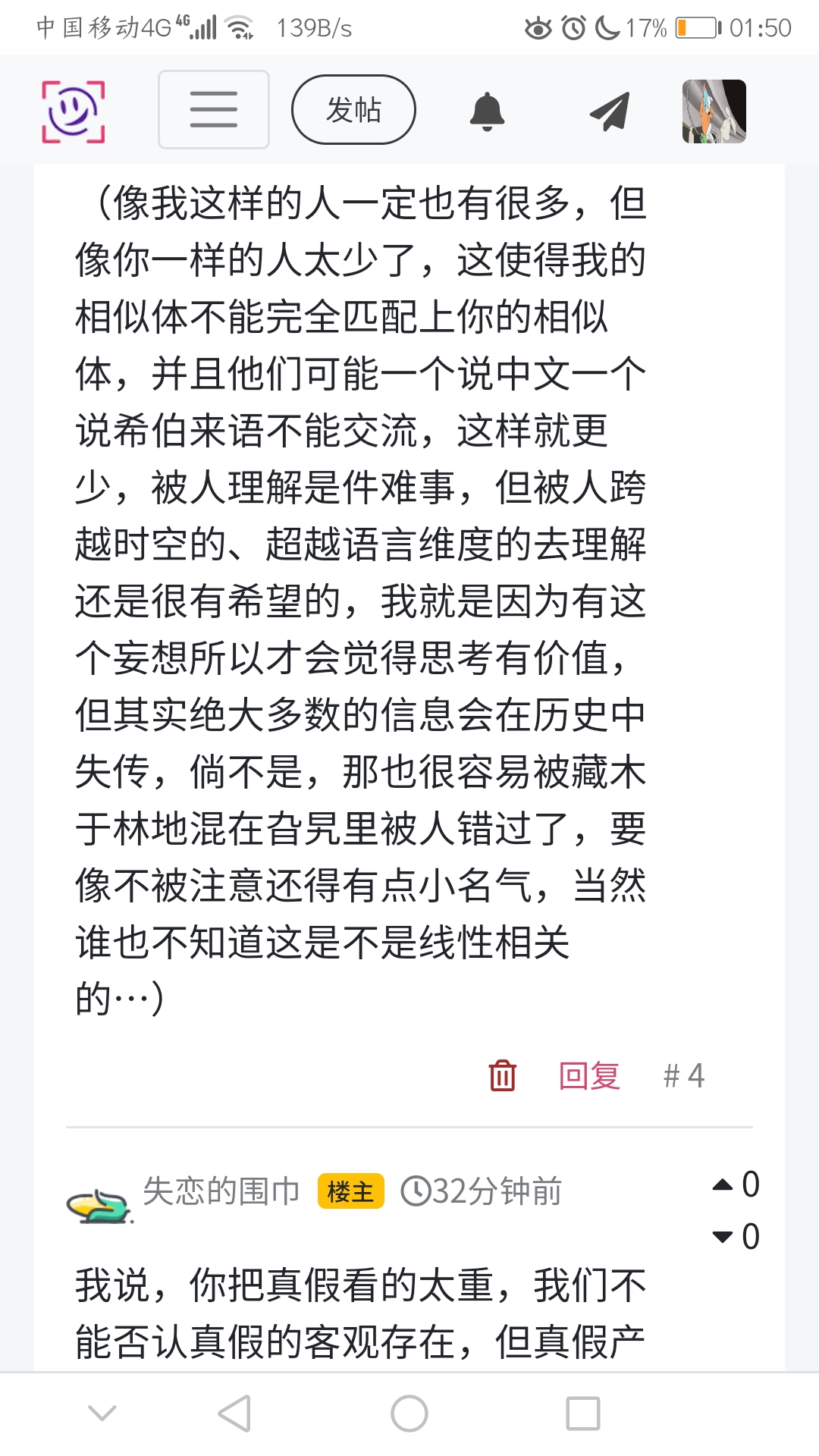 (像我这样的人一定也有很多,但像你一样的人太少了,这使得我的相似体不能完全匹配上你的相似体,并且他们可能一个说中文一个说希伯来语不能交流,这样就更少,被人理解是件难事,但被人跨越时空的、超越语言维度的去理解还是很有希望的,我就是因为有这个妄想所以才会觉得思考有价值,但其实绝大多数的信息会在历史中失传,倘不是,那也很容易被藏木于林地混在旮旯里被人错过了,要像不被注意还得有点小名气,当然谁也不知道这是不是线性相关的…)