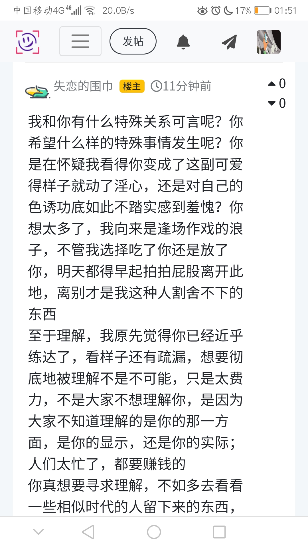 我和你有什么特殊关系可言呢?你希望什么样的特殊事情发生呢?你是在怀疑我看得你变成了这副可爱得样子就动了淫心,还是对自己的色诱功底如此不踏实感到羞愧?你想太多了,我向来是逢场作戏的浪子,不管我选择吃了你还是放了你,明天都得早起拍拍屁股离开此地,离别才是我这种人割舍不下的东西