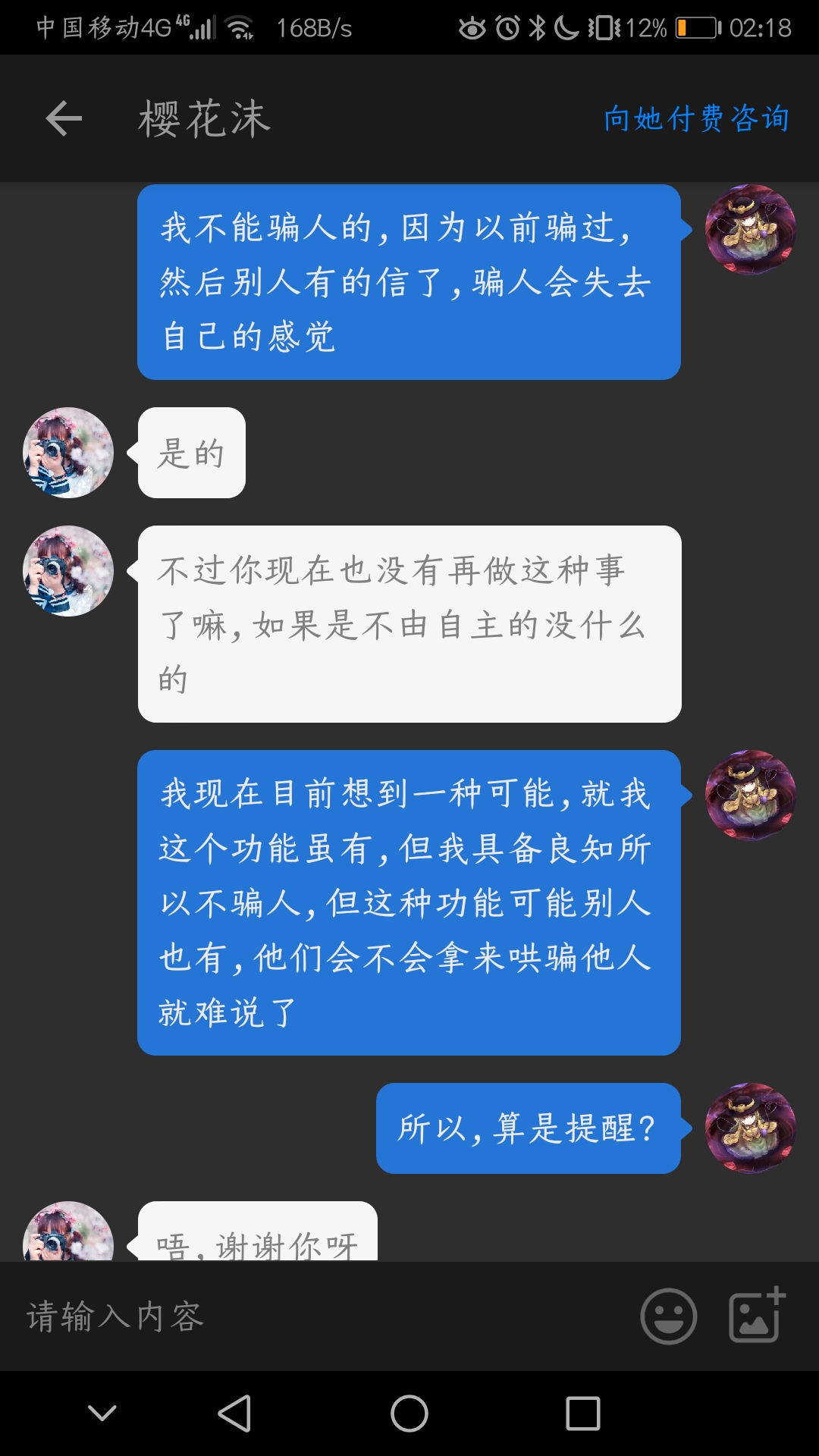 我现在目前想到一种可能,就我这个功能虽有,但我具备良知所以不骗人,但这种功能可能别人也有,他们会不会拿来哄骗他人就难说了