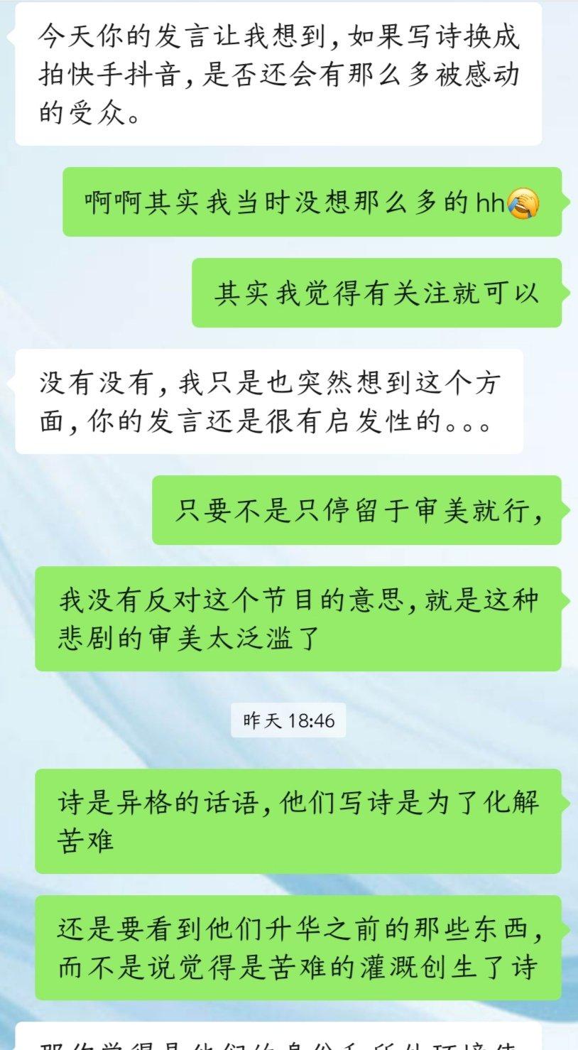 今天你的发言让我想到,如果写诗换成拍快手抖音,是否还会有那么多被感动的受众。