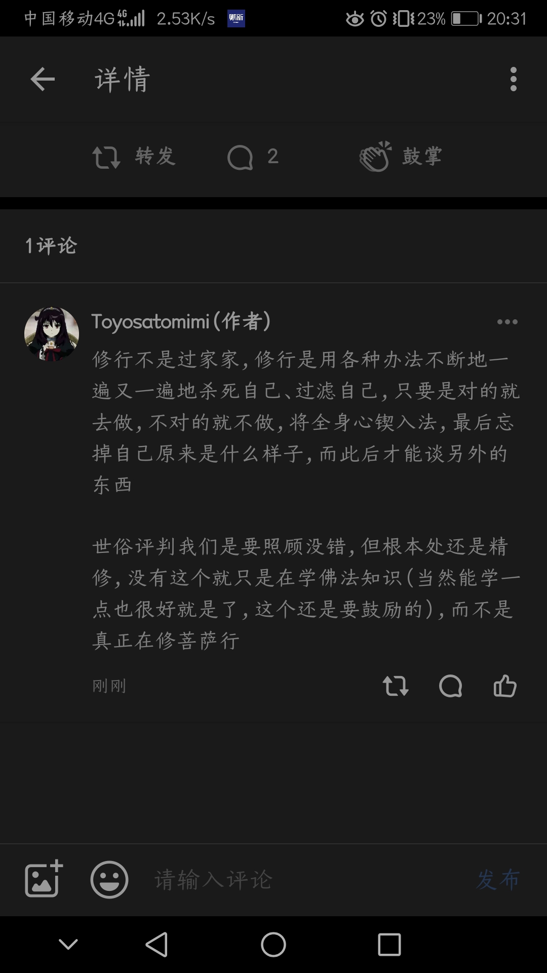 事实上,扫相破执的修炼有时是非常残酷的,非常反人性的,非常不利于和谐统一的,但真相就是这个,你可以说不应该让大家认识到这个,宣传善有善报的理念对社会和个人好处多多,那没问题;但如果你希求的是真相,那就意味着你骨子里必须坚毅勇猛,不能轻易被妄语带跑偏