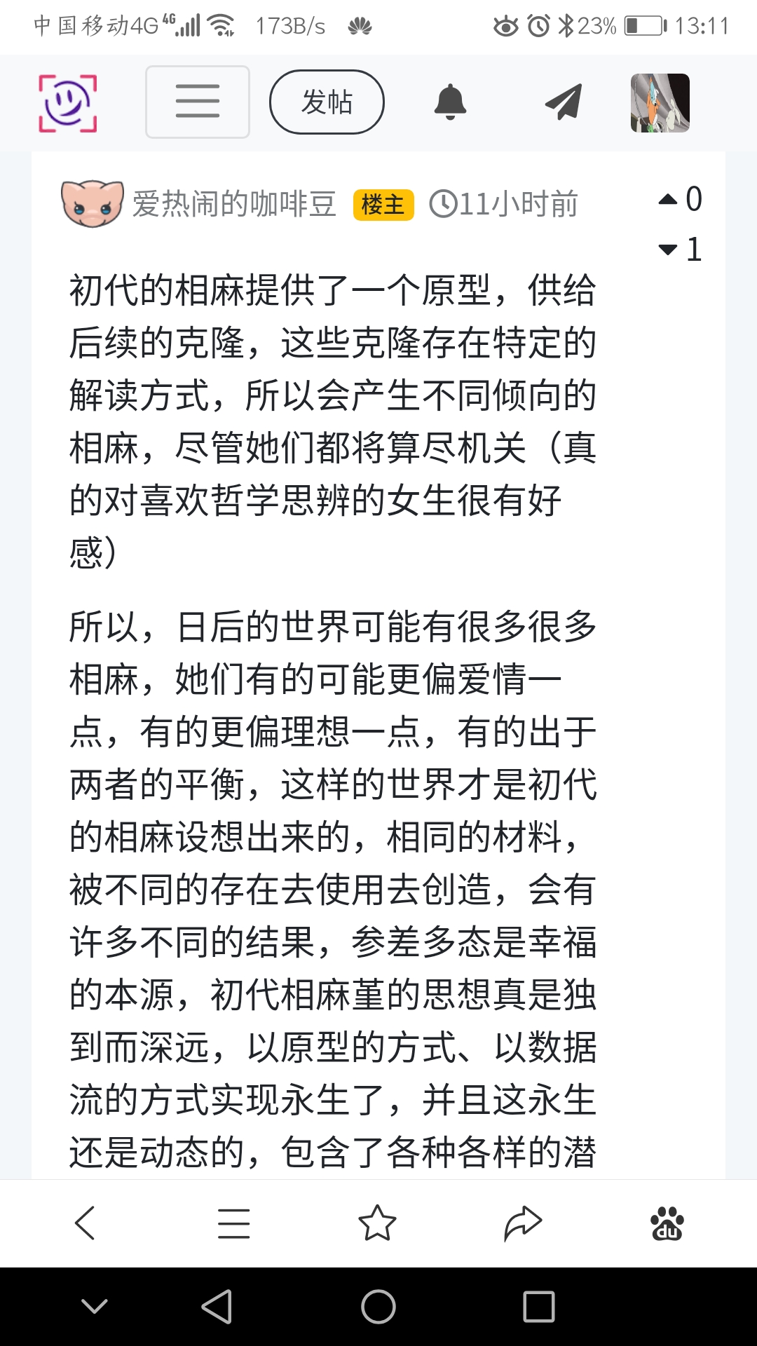 所以,日后的世界可能有很多很多相麻,她们有的可能更偏爱情一点,有的更偏理想一点,有的出于两者的平衡,这样的世界才是初代的相麻设想出来的,相同的材料,被不同的存在去使用去创造,会有许多不同的结果,参差多态是幸福的本源,初代相麻堇的思想真是独到而深远,以原型的方式、以数据流的方式实现永生了,并且这永生还是动态的,包含了各种各样的潜在可能性