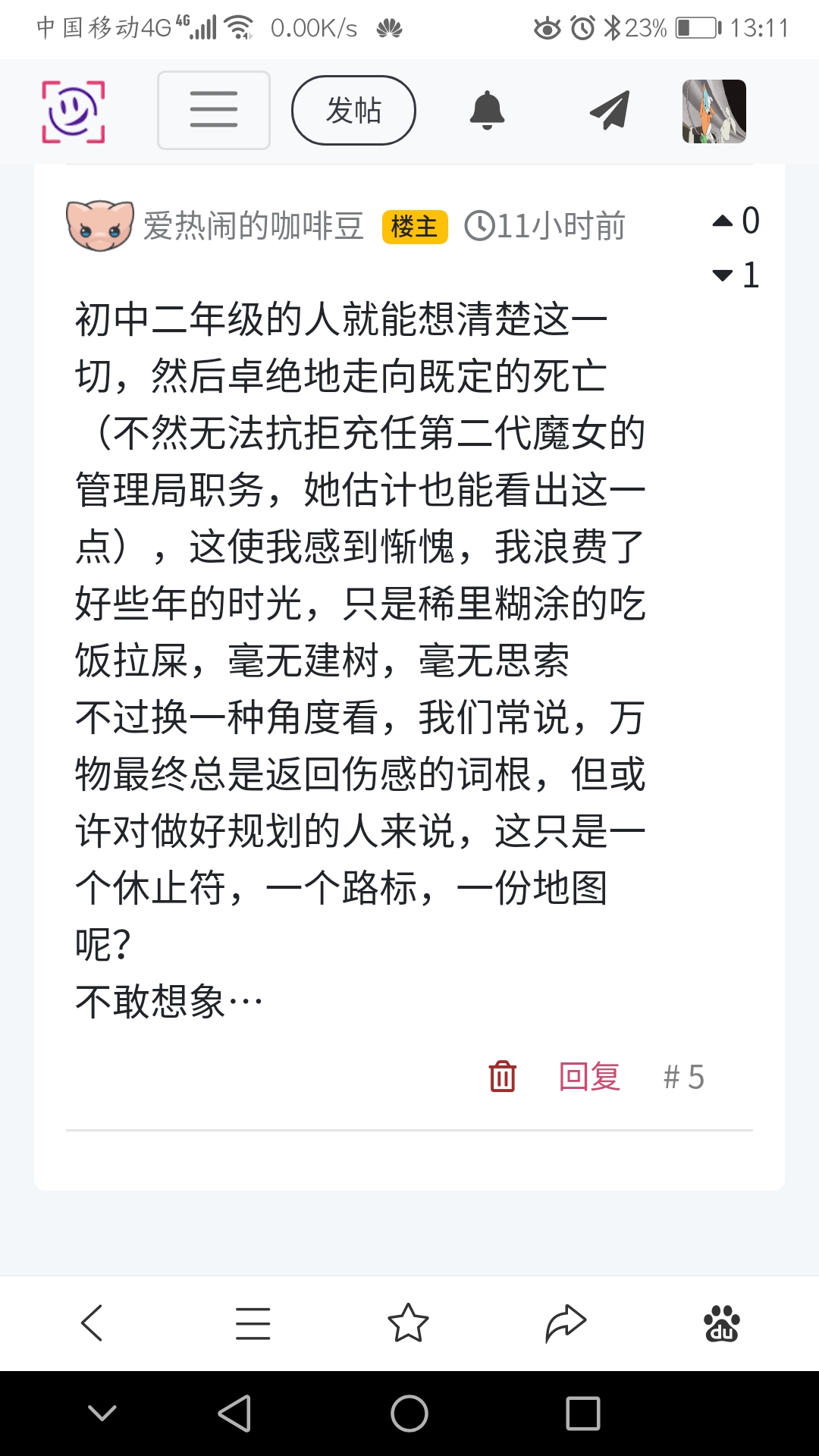 初中二年级的人就能想清楚这一切,然后卓绝地走向既定的死亡(不然无法抗拒充任第二代魔女的管理局职务,她估计也能看出这一点),这使我感到惭愧,我浪费了好些年的时光,只是稀里糊涂的吃饭拉屎,毫无建树,毫无思索