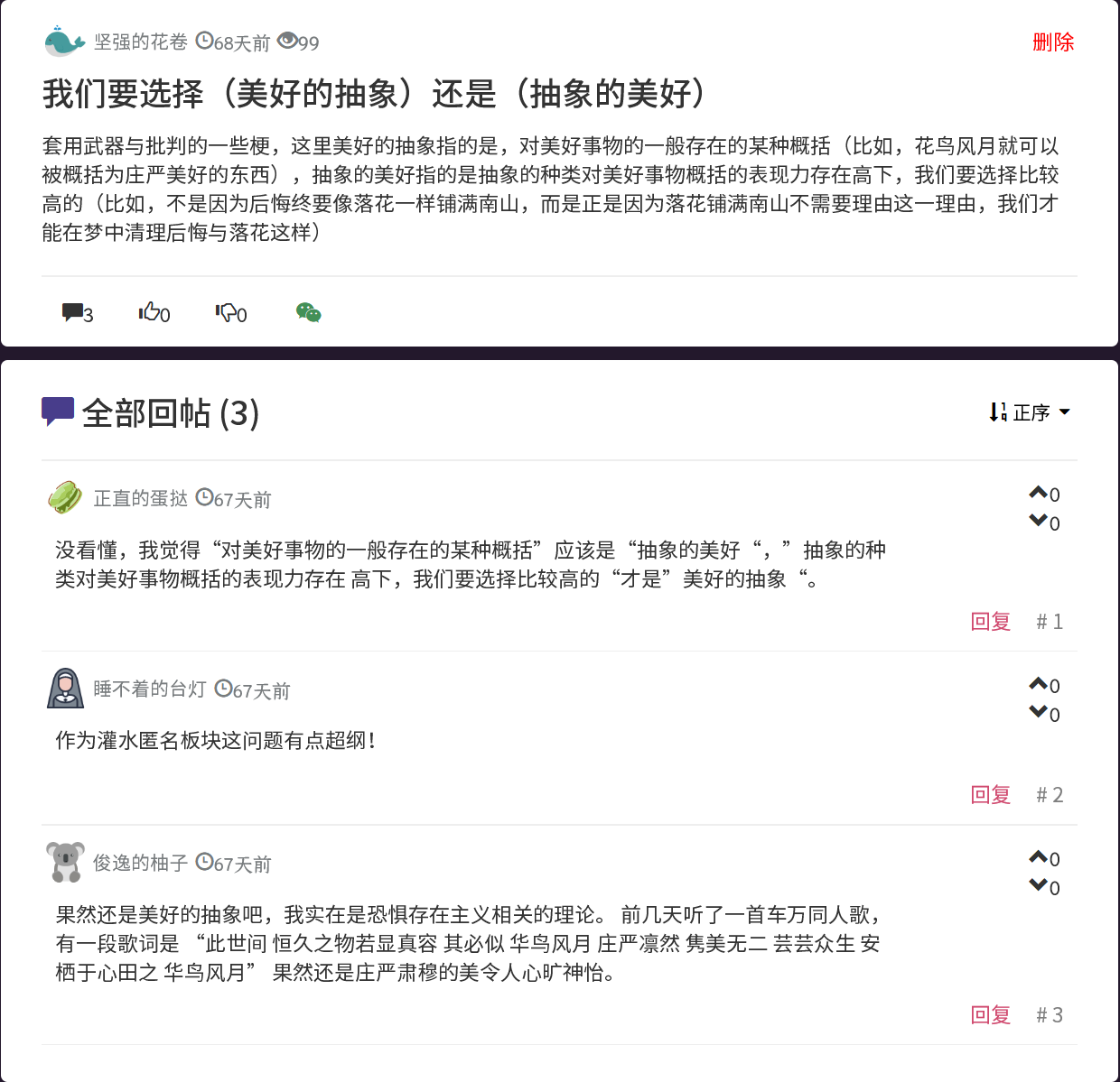 我们要选择美好的抽象还是抽象的美好 发表于 2019-11-05 更新于 2025-11-27 本文字数: 374 阅读时长 ≈ 1 分钟 原帖:https://web.archive.org/web/20210308181018/https://www.lgulife.com/bbs/post/46 阅读全文 »