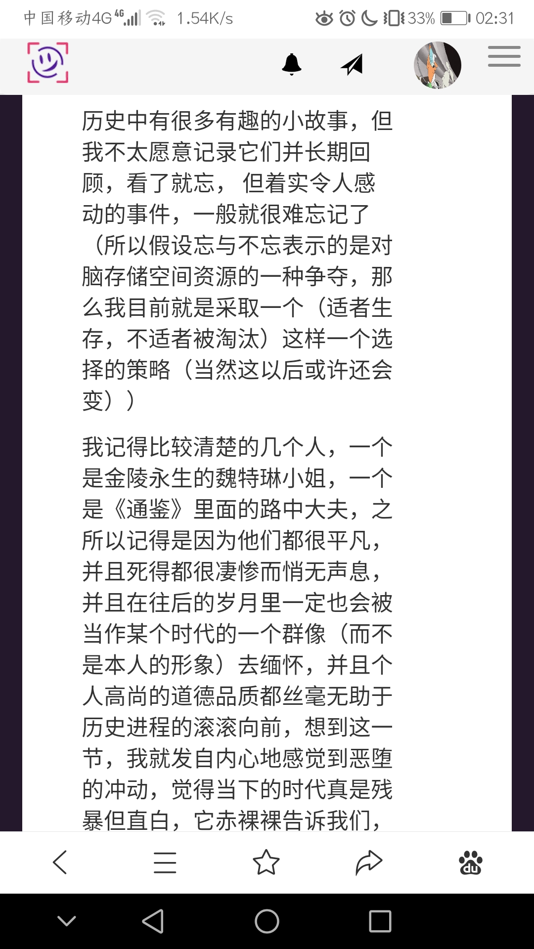 我记得比较清楚的几个人,一个是金陵永生的魏特琳小姐,一个是《通鉴》里面的路中大夫,之所以记得是因为他们都很平凡,并且死得都很凄惨而悄无声息,并且在往后的岁月里一定也会被当作某个时代的一个群像(而不是本人的形象)去缅怀,并且个人高尚的道德品质都丝毫无助于历史进程的滚滚向前,想到这一节,我就发自内心地感觉到恶堕的冲动,觉得当下的时代真是残暴但直白,它赤裸裸告诉我们,几乎所有人都是不会被记住的