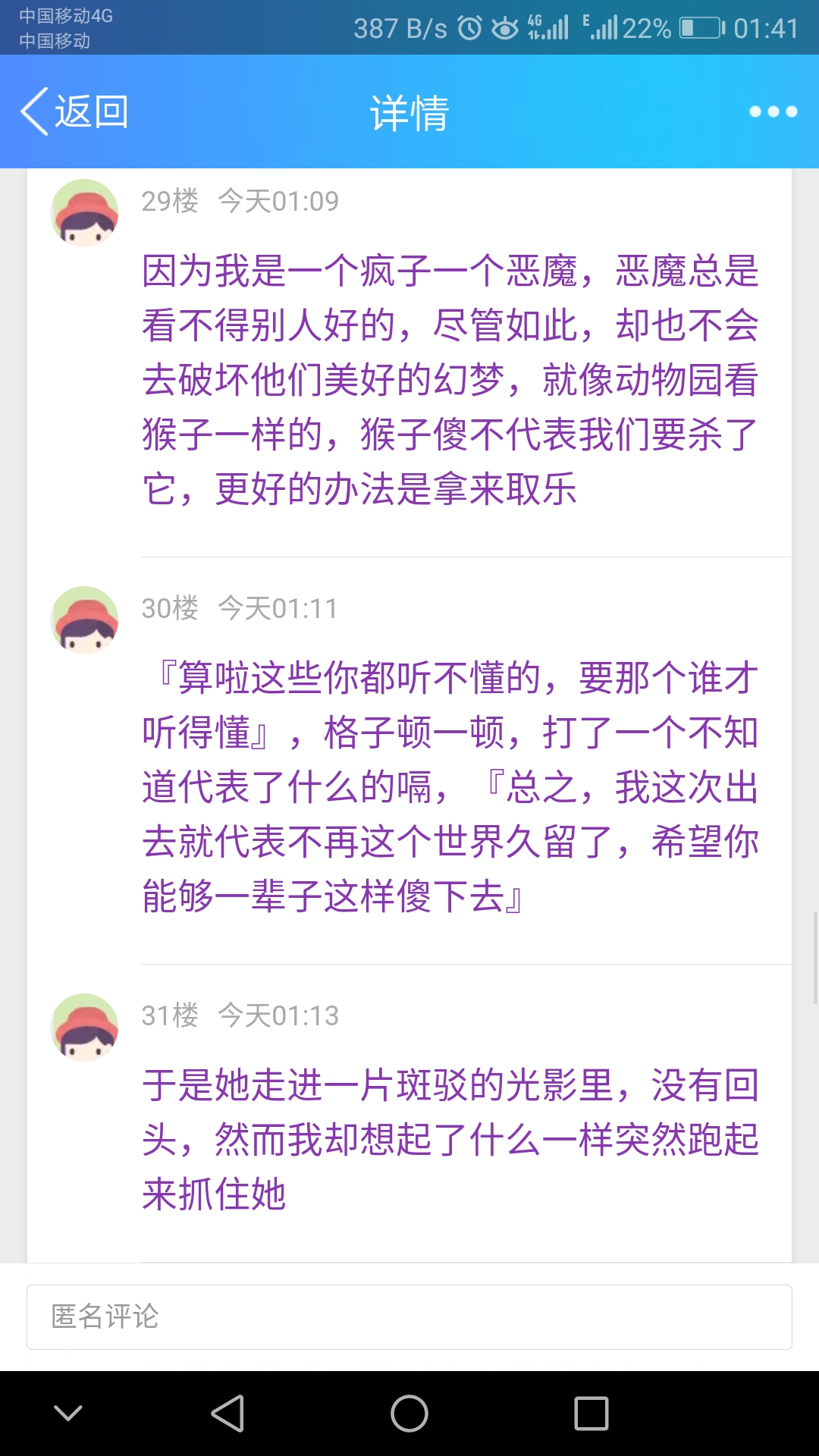 因为我是一个疯子一个恶魔,恶魔总是看不得别人好的,尽管如此,却也不会去破坏他们美好的幻梦,就像动物园看猴子一样的,猴子傻不代表我们要杀了它,更好的办法是拿来取乐