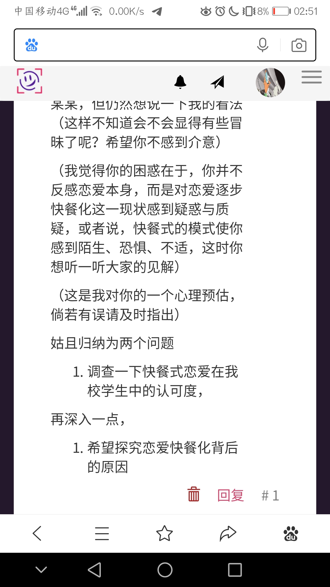 感觉快餐式恋爱在大学其实挺普遍的(?我个人是觉得,大部分人谈快餐式恋爱的初衷是想找一个人陪自己,吃饭出去玩泡图书馆有人陪之类的x 毕竟在龙大这么一个学校,是很容易感到孤独的。(当然这也只是我的个人见解 周围有坚决拒绝快餐式恋爱的人,也有谈过一次之后受到极大伤害的人,当然也有海王(? 想知道大家是如何看待快餐式恋爱的?