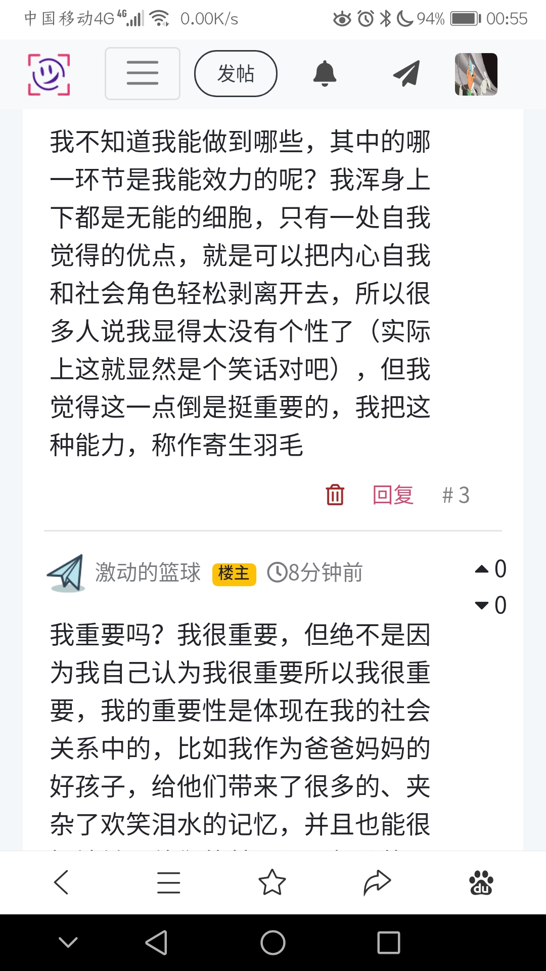 我不知道我能做到哪些,其中的哪一环节是我能效力的呢?我浑身上下都是无能的细胞,只有一处自我觉得的优点,就是可以把内心自我和社会角色轻松剥离开去,所以很多人说我显得太没有个性了(实际上这就显然是个笑话对吧),但我觉得这一点倒是挺重要的,我把这种能力,称作寄生羽毛