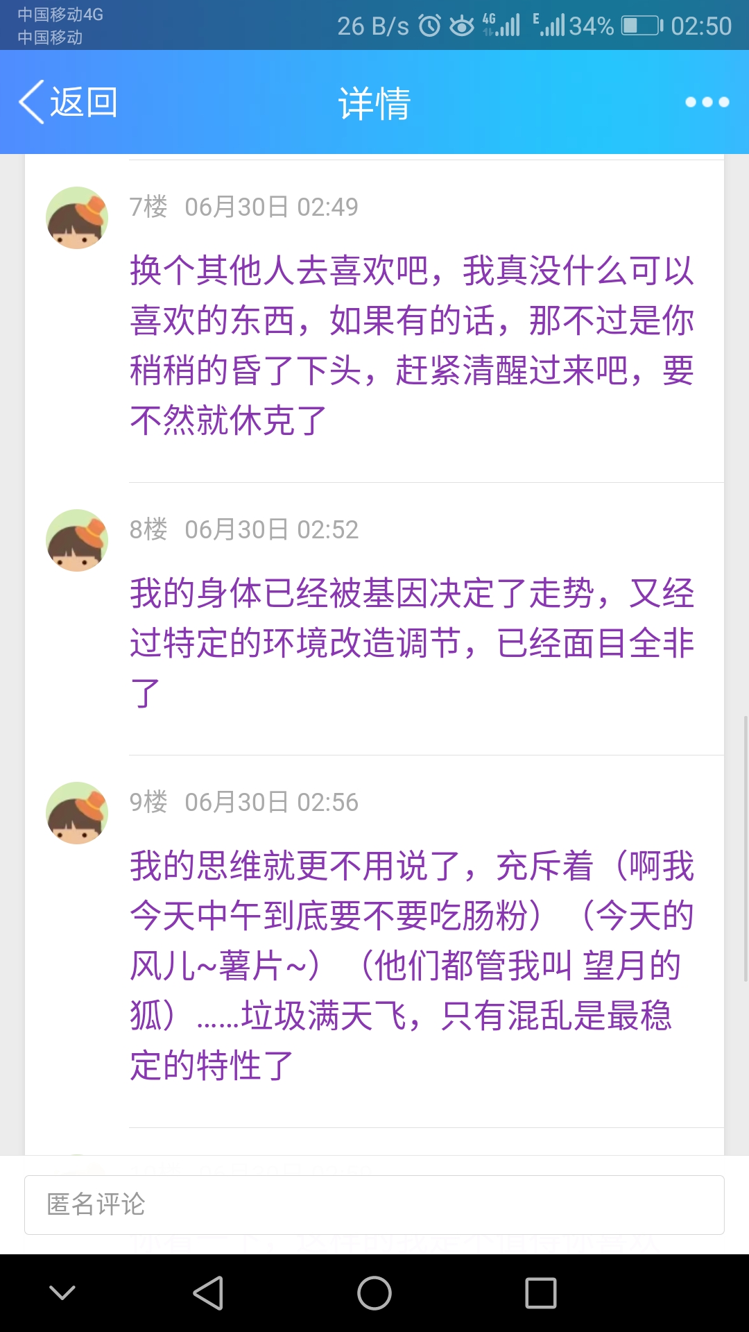 我的思维就更不用说了,充斥着(啊我今天中午到底要不要吃肠粉)(今天的风儿薯片)(他们都管我叫 望月的狐)……垃圾满天飞,只有混乱是最稳定的特性了