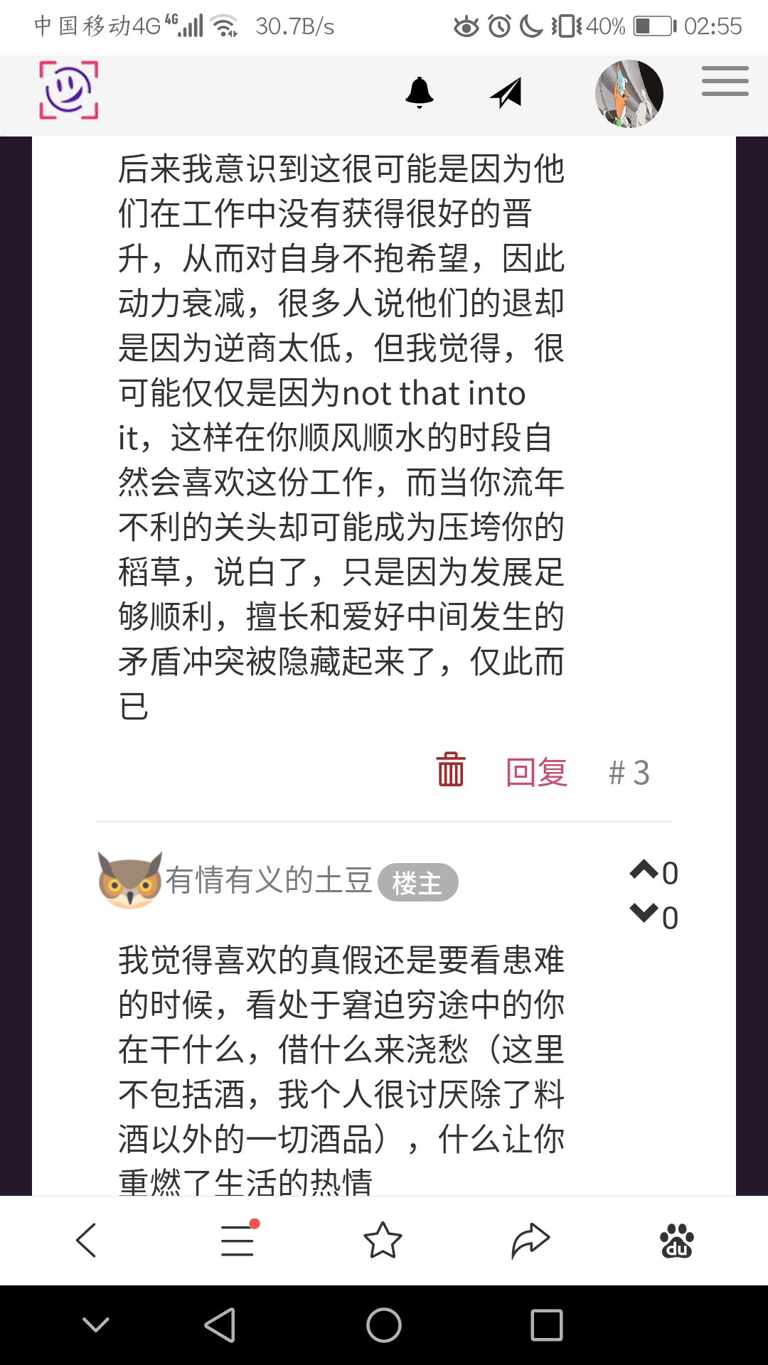 后来我意识到这很可能是因为他们在工作中没有获得很好的晋升,从而对自身不抱希望,因此动力衰减,很多人说他们的退却是因为逆商太低,但我觉得,很可能仅仅是因为not that into it,这样在你顺风顺水的时段自然会喜欢这份工作,而当你流年不利的关头却可能成为压垮你的稻草,说白了,只是因为发展足够顺利,擅长和爱好中间发生的矛盾冲突被隐藏起来了,仅此而已