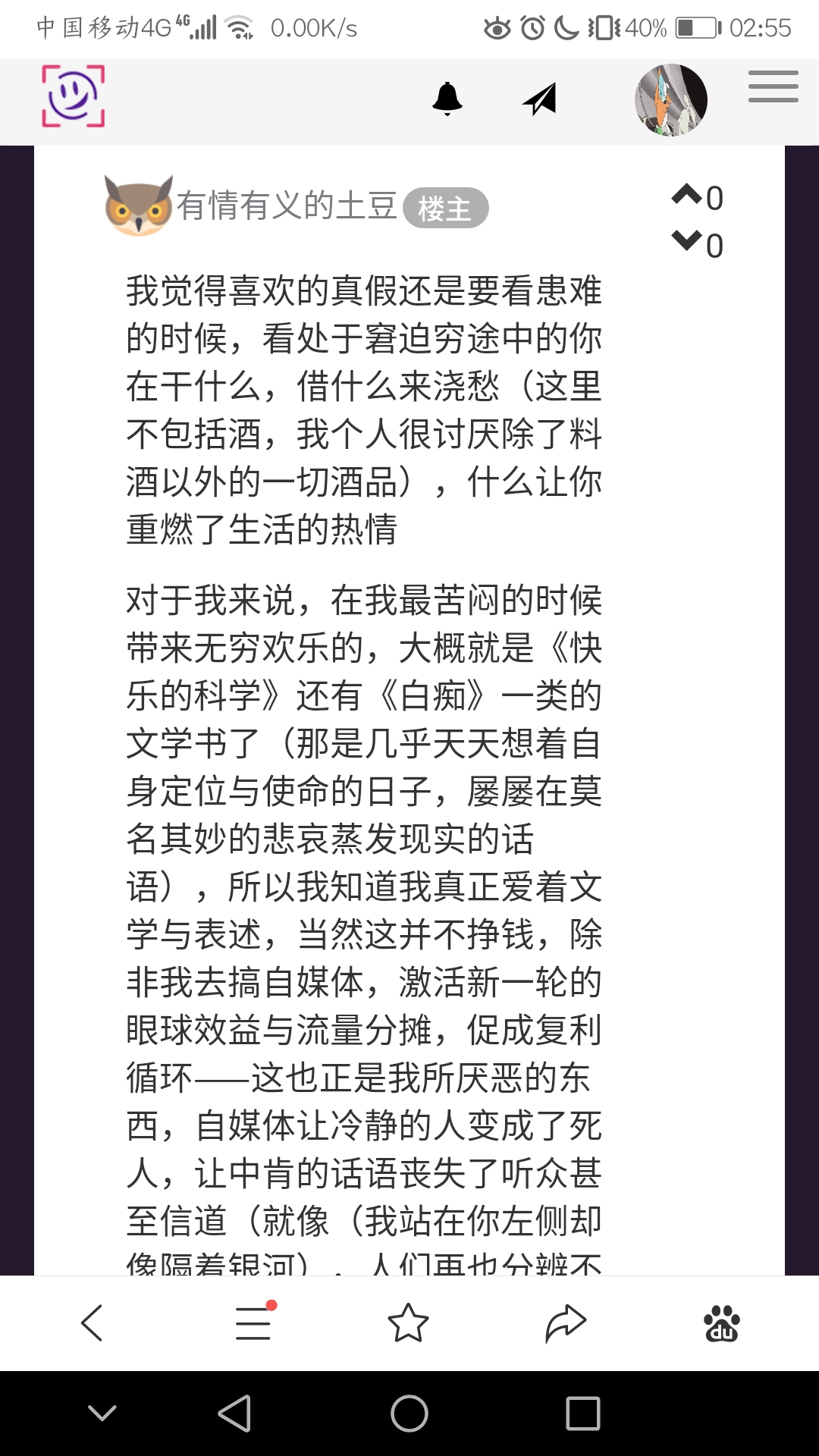 对于我来说,在我最苦闷的时候带来无穷欢乐的,大概就是《快乐的科学》还有《白痴》一类的文学书了(那是几乎天天想着自身定位与使命的日子,屡屡在莫名其妙的悲哀蒸发现实的话语),所以我知道我真正爱着文学与表述,当然这并不挣钱,除非我去搞自媒体,激活新一轮的眼球效益与流量分摊,促成复利循环——这也正是我所厌恶的东西,自媒体让冷静的人变成了死人,让中肯的话语丧失了听众甚至信道(就像(我站在你左侧却像隔着银河),人们再也分辨不出真假了,他们只是昼夜说着流行而俗套单调的字句,终有一天顺便连母语也彻底废弃)