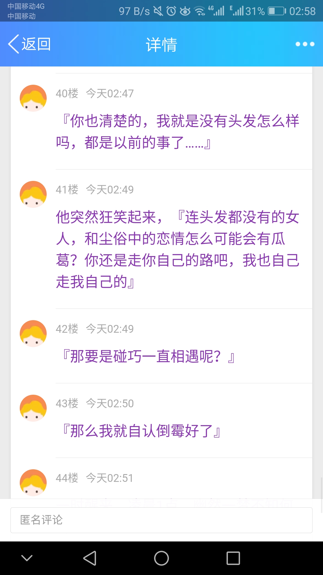 他突然狂笑起来,『连头发都没有的女人,和尘俗中的恋情怎么可能会有瓜葛?你还是走你自己的路吧,我也自己走我自己的』