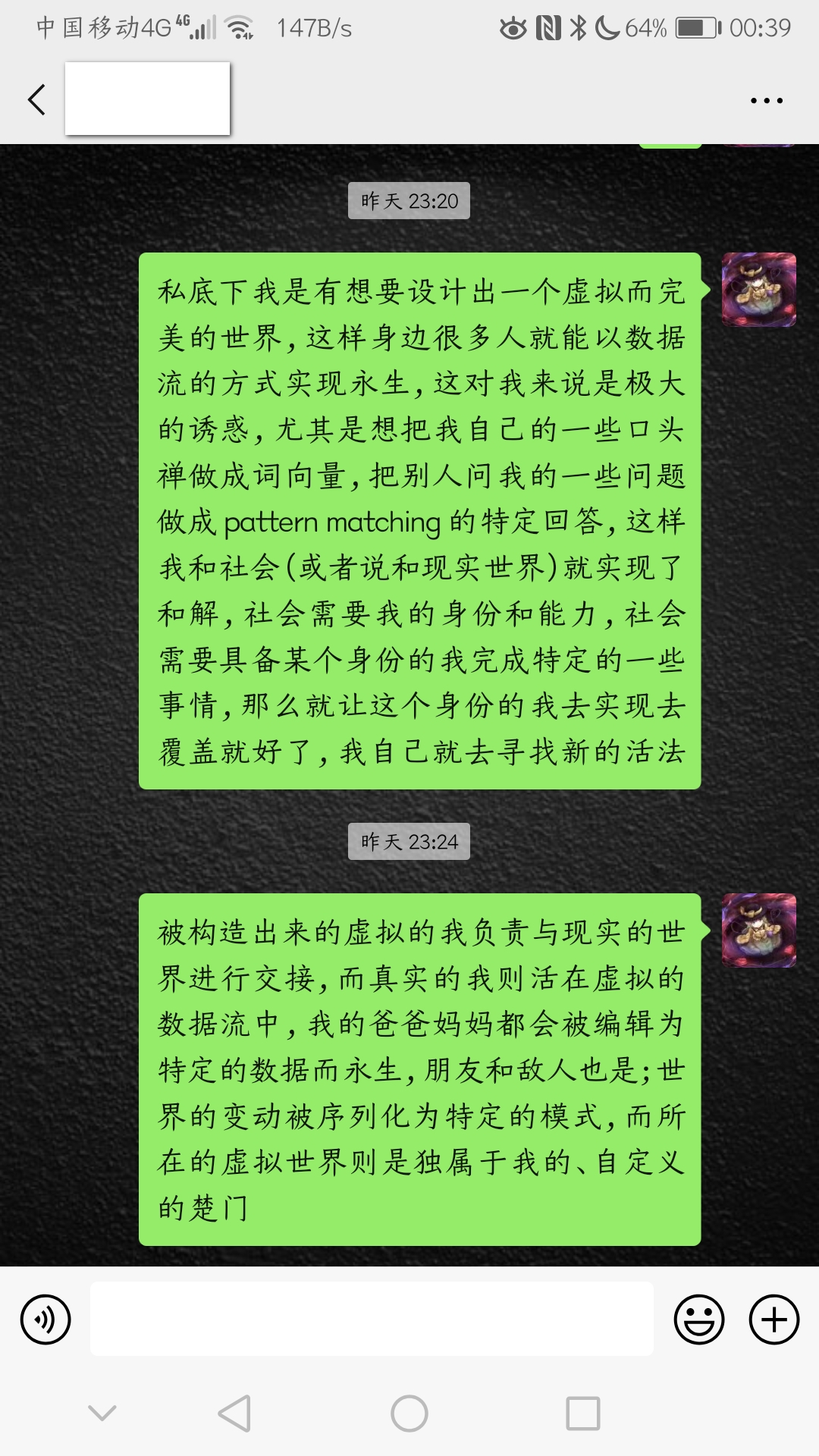 私底下我是有想要设计出一个虚拟而完美的世界,这样身边很多人就能以数据流的方式实现永生,这对我来说是极大的诱惑,尤其是想把我自己的一些囗头禅做成词向量,把别人问我的一些问题做成pattern matching的特定回答,这样我和社会(或者说和现实世界)就实现了和解,社会需要我的身份和能力,社会需要具备某个身份的我完成特定的一些事情,那么就让这个身份的我去实现去覆盖就好了,我自己就去寻找新的活法