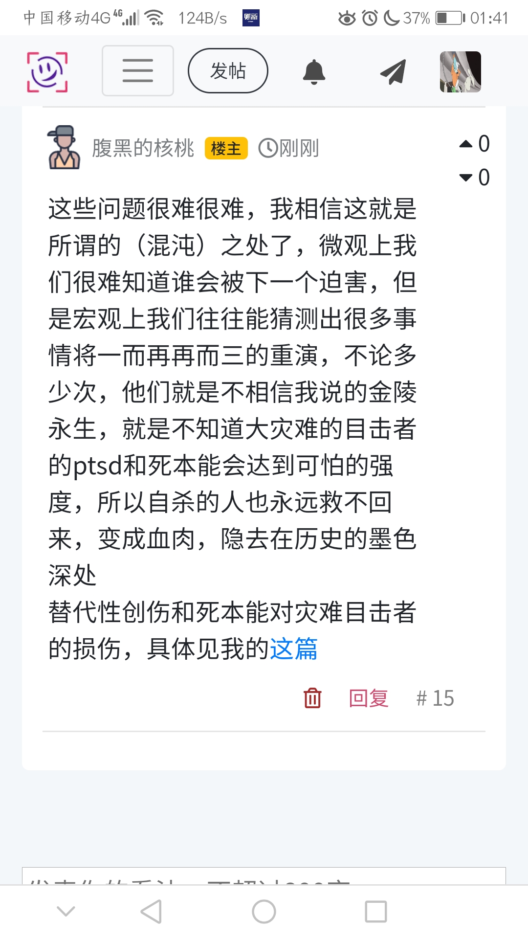 这些问题很难很难,我相信这就是所谓的(混沌)之处了,微观上我们很难知道谁会被下一个迫害,但是宏观上我们往往能猜测出很多事情将一而再再而三的重演,不论多少次,他们就是不相信我说的金陵永生,就是不知道大灾难的目击者的ptsd和死本能会达到可怕的强度,所以自杀的人也永远救不回来,变成血肉,隐去在历史的墨色深处