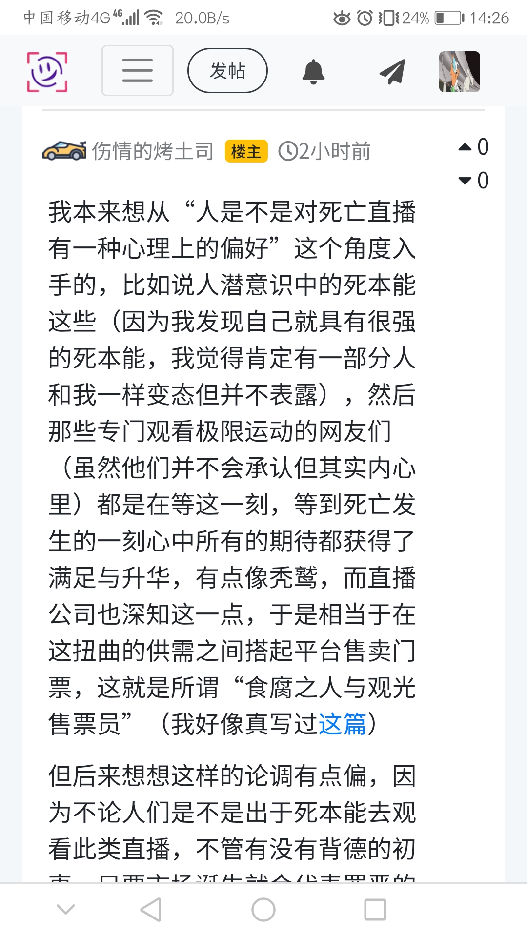 我本来想从“人是不是对死亡直播有一种心理上的偏好”这个角度入手的,比如说人潜意识中的死本能这些(因为我发现自己就具有很强的死本能,我觉得肯定有一部分人和我一样变态但并不表露),然后那些专门观看极限运动的网友们(虽然他们并不会承认但其实内心里)都是在等这一刻,等到死亡发生的一刻心中所有的期待都获得了满足与升华,有点像秃鹫,而直播公司也深知这一点,于是相当于在这扭曲的供需之间搭起平台售卖门票,这就是所谓“食腐之人与观光售票员”(我好像真写过这篇)