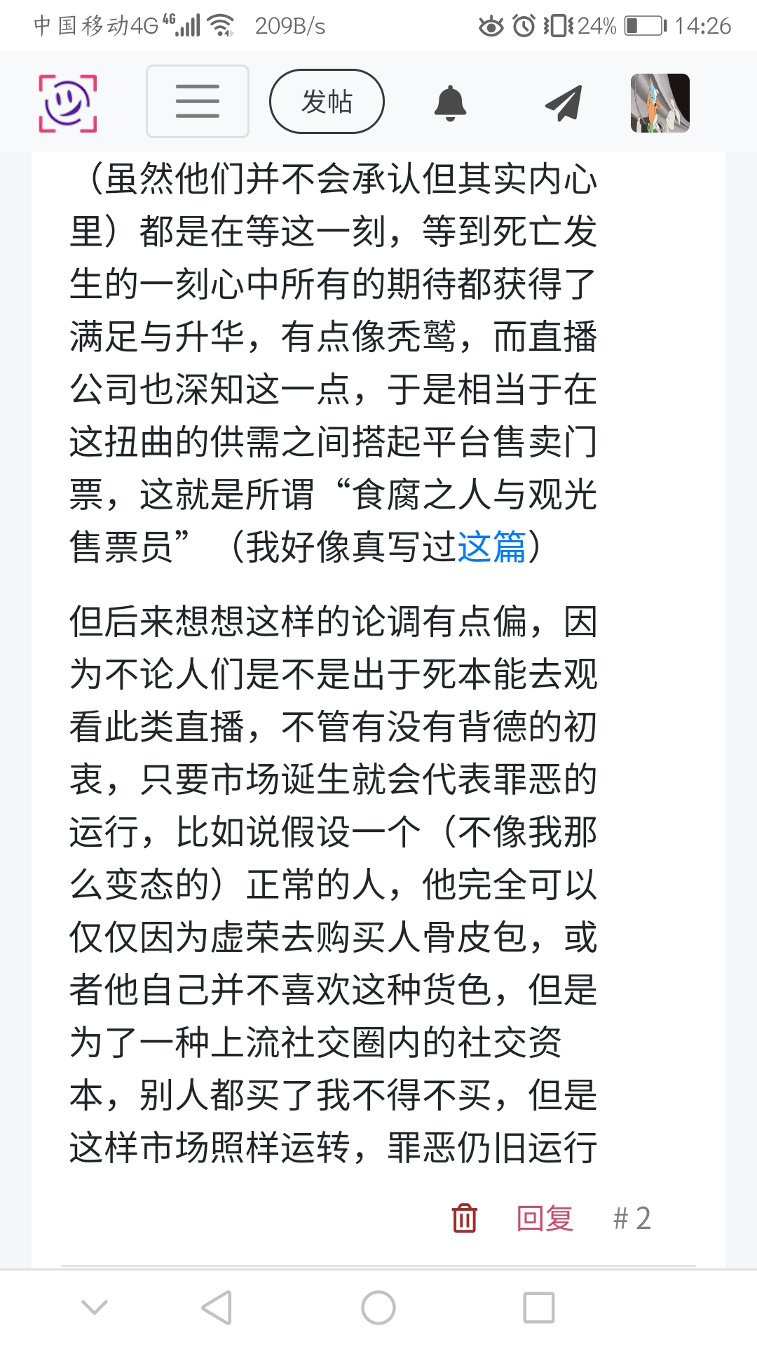 但后来想想这样的论调有点偏,因为不论人们是不是出于死本能去观看此类直播,不管有没有背德的初衷,只要市场诞生就会代表罪恶的运行,比如说假设一个(不像我那么变态的)正常的人,他完全可以仅仅因为虚荣去购买人骨皮包,或者他自己并不喜欢这种货色,但是为了一种上流社交圈内的社交资本,别人都买了我不得不买,但是这样市场照样运转,罪恶仍旧运行