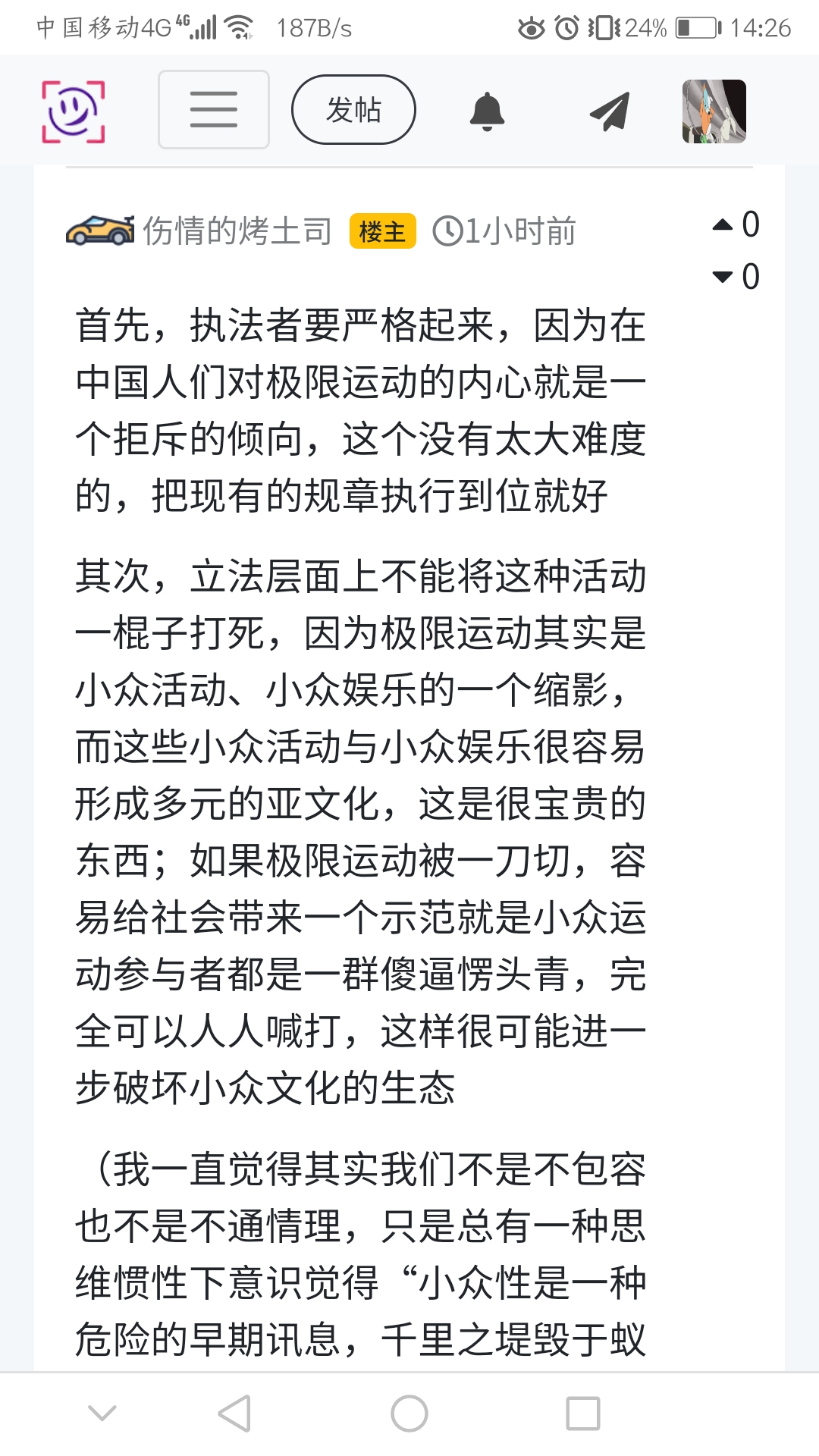 其次,立法层面上不能将这种活动一棍子打死,因为极限运动其实是小众活动、小众娱乐的一个缩影,而这些小众活动与小众娱乐很容易形成多元的亚文化,这是很宝贵的东西;如果极限运动被一刀切,容易给社会带来一个示范就是小众运动参与者都是一群傻逼愣头青,完全可以人人喊打,这样很可能进一步破坏小众文化的生态