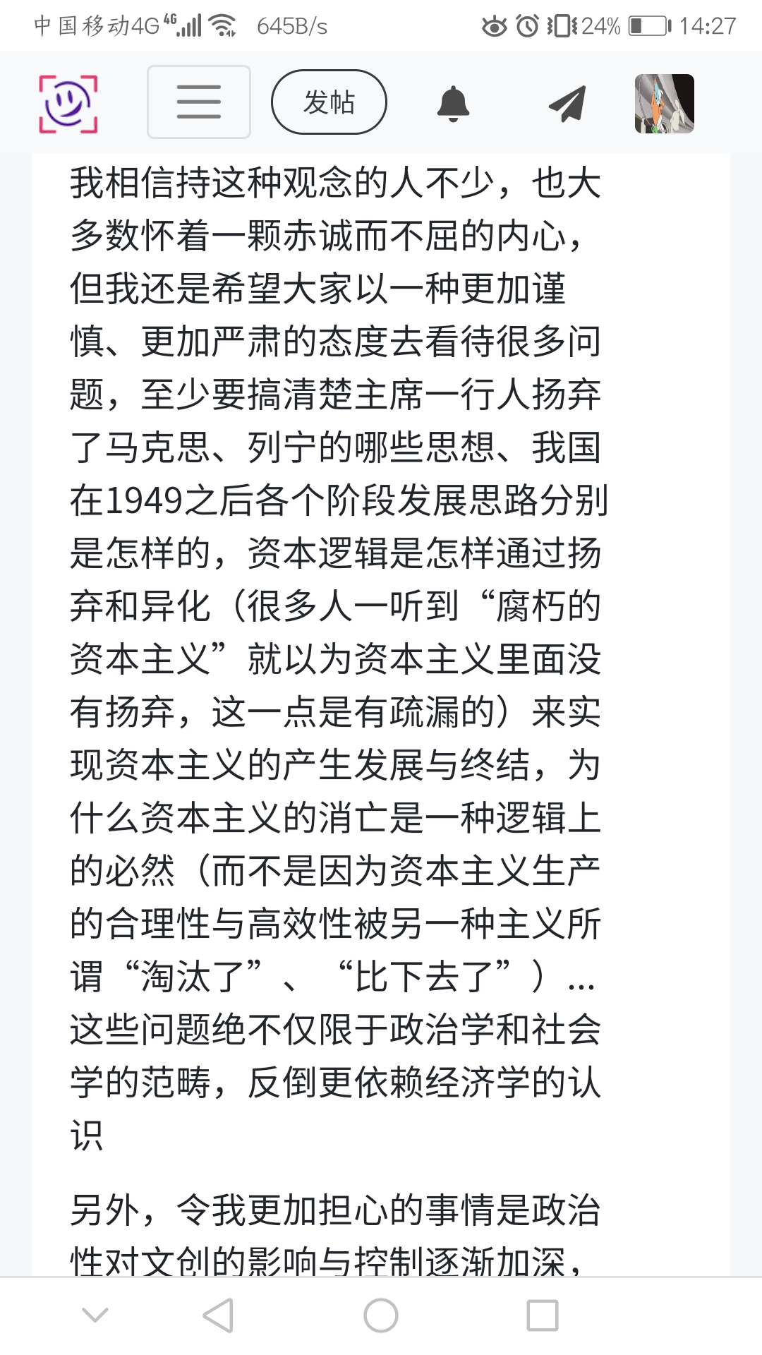 我相信持这种观念的人不少,也大多数怀着一颗赤诚而不屈的内心,但我还是希望大家以一种更加谨慎、更加严肃的态度去看待很多问题,至少要搞清楚主席一行人扬弃了马克思、列宁的哪些思想、我国在1949之后各个阶段发展思路分别是怎样的,资本逻辑是怎样通过扬弃和异化(很多人一听到“腐朽的资本主义”就以为资本主义里面没有扬弃,这一点是有疏漏的)来实现资本主义的产生发展与终结,为什么资本主义的消亡是一种逻辑上的必然(而不是因为资本主义生产的合理性与高效性被另一种主义所谓“淘汰了”、“比下去了”)…这些问题绝不仅限于政治学和社会学的范畴,反倒更依赖经济学的认识