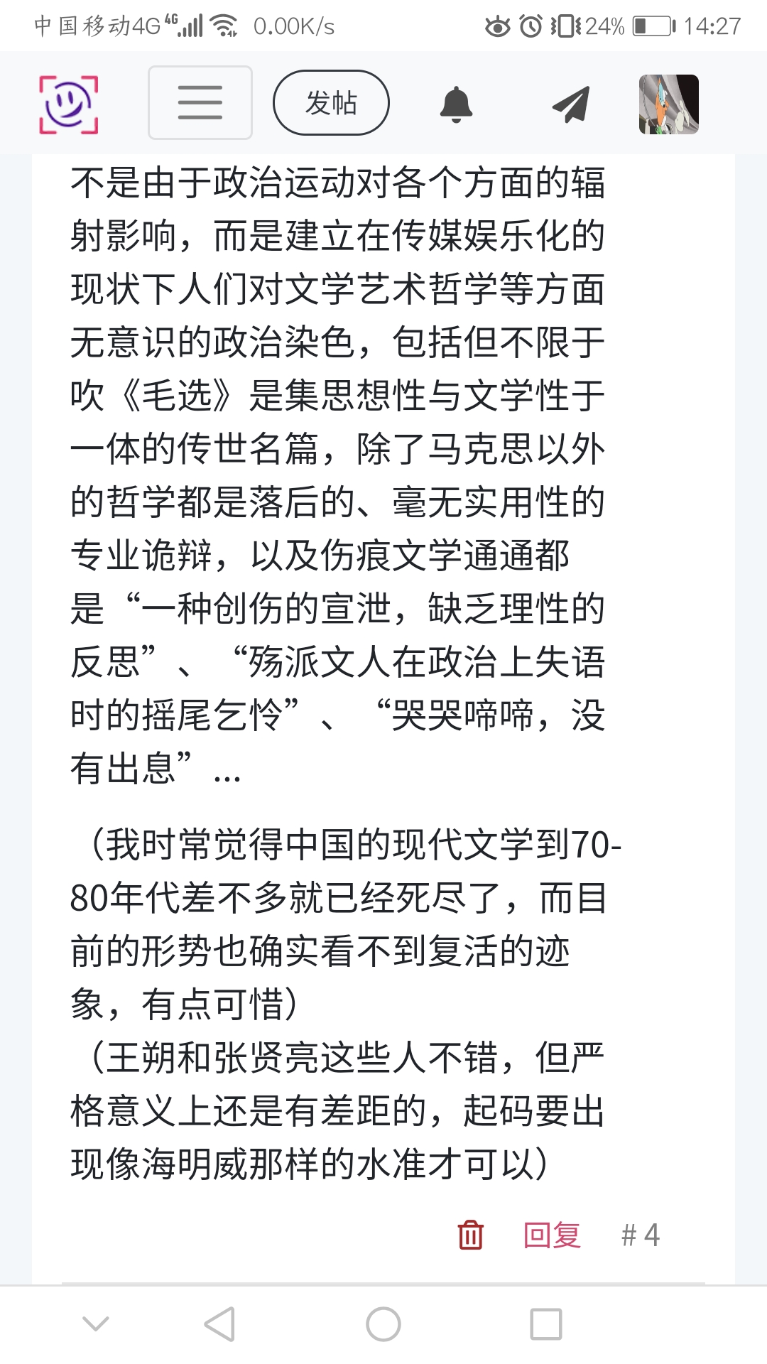 另外,令我更加担心的事情是政治性对文创的影响与控制逐渐加深,并且来得是更加隐蔽,因为这次并不是由于政治运动对各个方面的辐射影响,而是建立在传媒娱乐化的现状下人们对文学艺术哲学等方面无意识的政治染色,包括但不限于吹《毛选》是集思想性与文学性于一体的传世名篇,除了马克思以外的哲学都是落后的、毫无实用性的专业诡辩,以及伤痕文学通通都是“一种创伤的宣泄,缺乏理性的反思”、“殇派文人在政治上失语时的摇尾乞怜”、“哭哭啼啼,没有出息”…