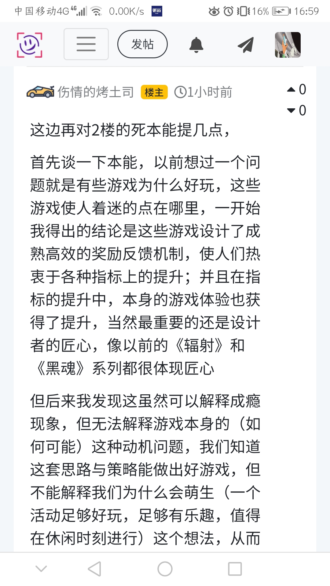 首先谈一下本能,以前想过一个问题就是有些游戏为什么好玩,这些游戏使人着迷的点在哪里,一开始我得出的结论是这些游戏设计了成熟高效的奖励反馈机制,使人们热衷于各种指标上的提升;并且在指标的提升中,本身的游戏体验也获得了提升,当然最重要的还是设计者的匠心,像以前的《辐射》和《黑魂》系列都很体现匠心