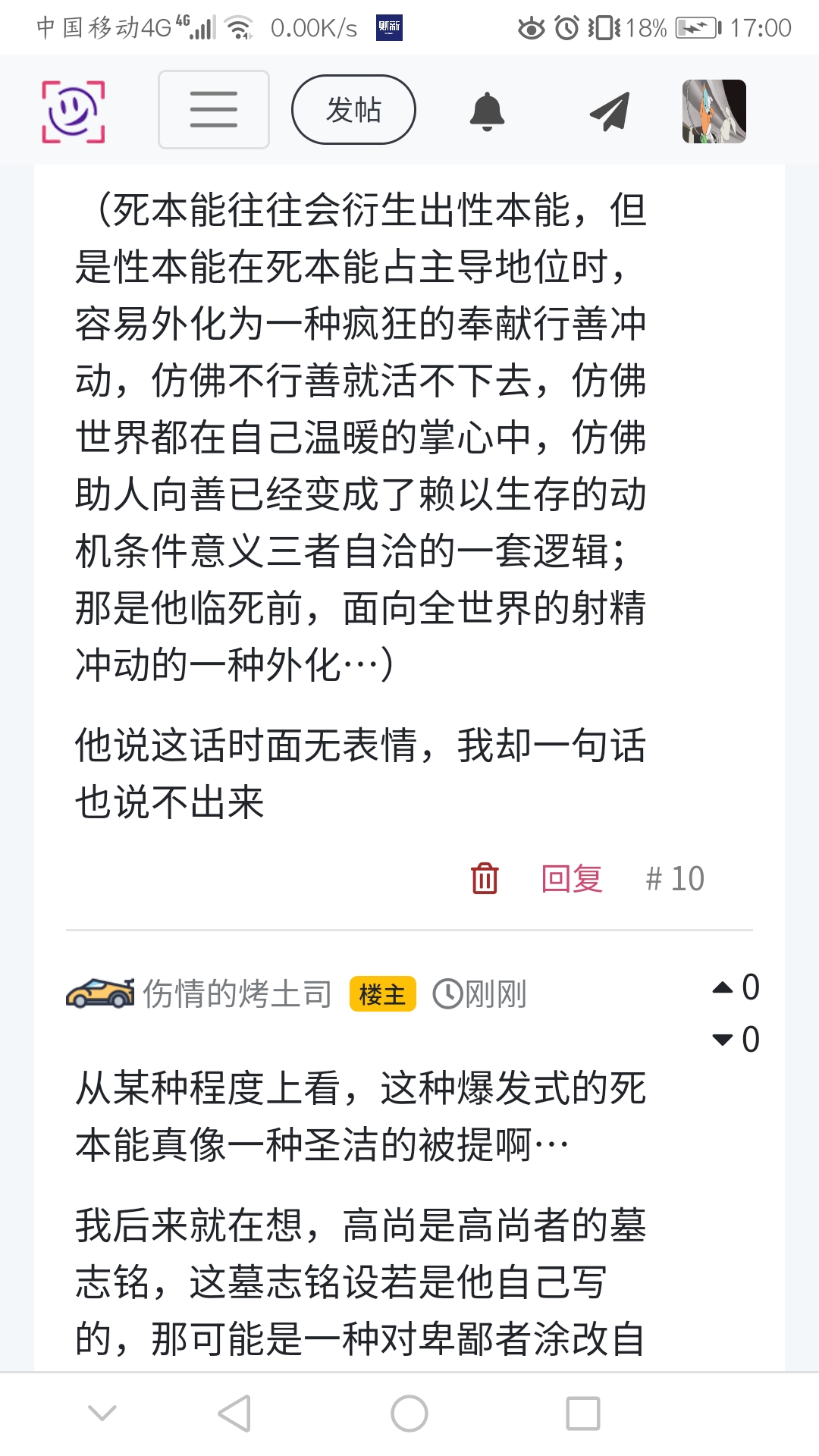 (死本能往往会衍生出性本能,但是性本能在死本能占主导地位时,容易外化为一种疯狂的奉献行善冲动,仿佛不行善就活不下去,仿佛世界都在自己温暖的掌心中,仿佛助人向善已经变成了赖以生存的动机条件意义三者自洽的一套逻辑;那是他临死前,面向全世界的射精冲动的一种外化…)