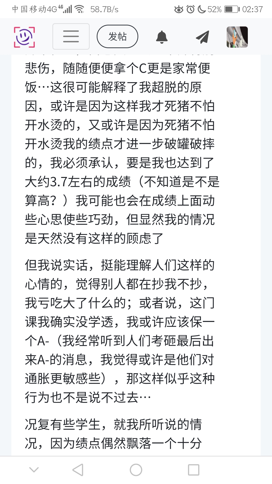 我必须承认,可能是因为我绩点已经低到一种根本救不回来的地步了,所以我似乎对作业不会这件事并不在意,白卷交上去也不算特别悲伤,随随便便拿个C更是家常便饭…这很可能解释了我超脱的原因,或许是因为这样我才死猪不怕开水烫的,又或许是因为死猪不怕开水烫我的绩点才进一步破罐破摔的,我必须承认,要是我也达到了大约3.7左右的成绩(不知道是不是算高?)我可能也会在成绩上面动些心思使些巧劲,但显然我的情况是天然没有这样的顾虑了