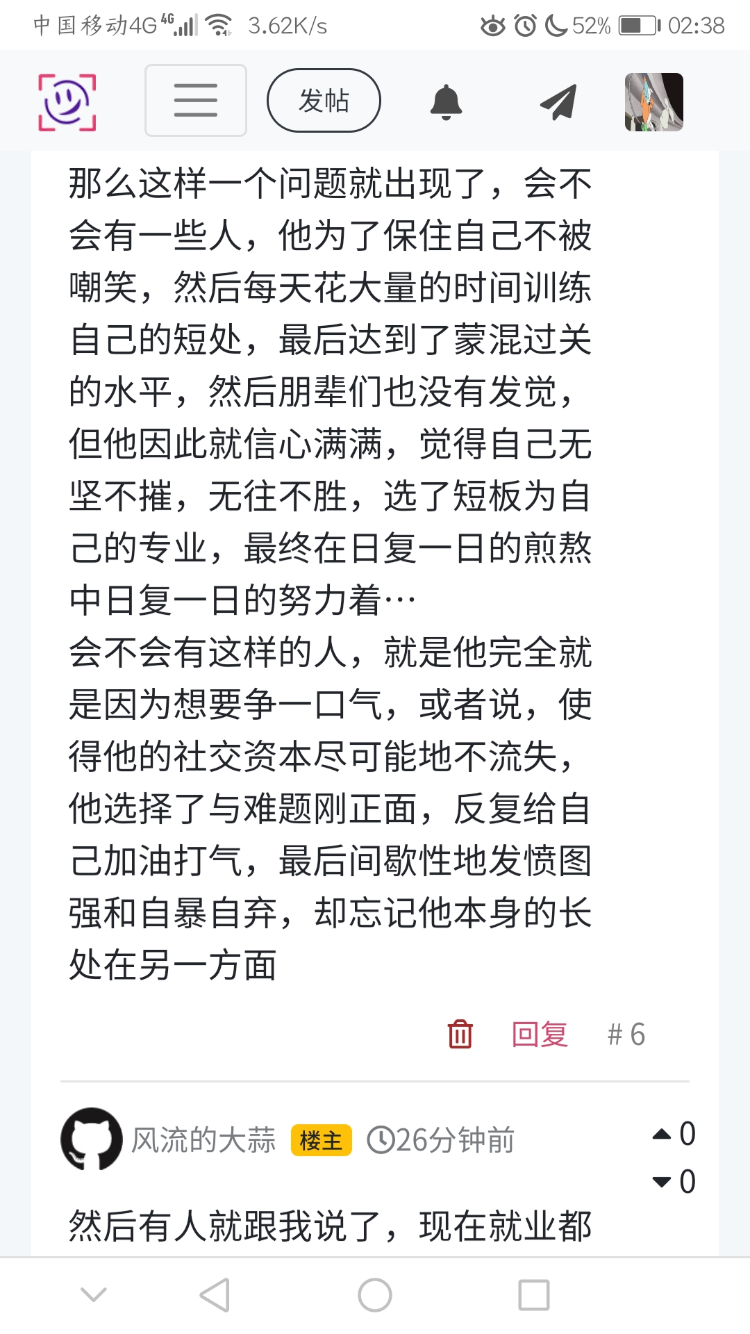 会不会有这样的人,就是他完全就是因为想要争一口气,或者说,使得他的社交资本尽可能地不流失,他选择了与难题刚正面,反复给自己加油打气,最后间歇性地发愤图强和自暴自弃,却忘记他本身的长处在另一方面