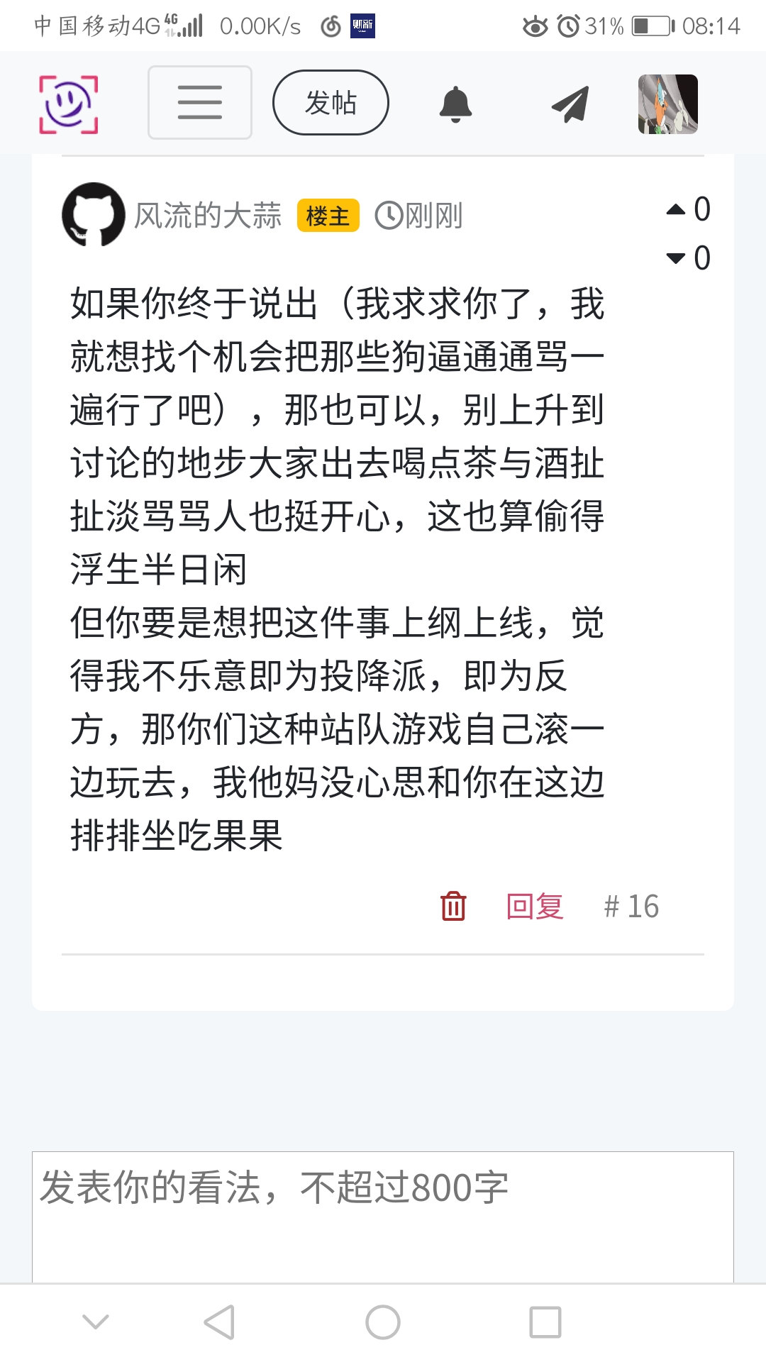 但你要是想把这件事上纲上线,觉得我不乐意即为投降派,即为反方,那你们这种站队游戏自己滚一边玩去,我他妈没心思和你在这边排排坐吃果果
