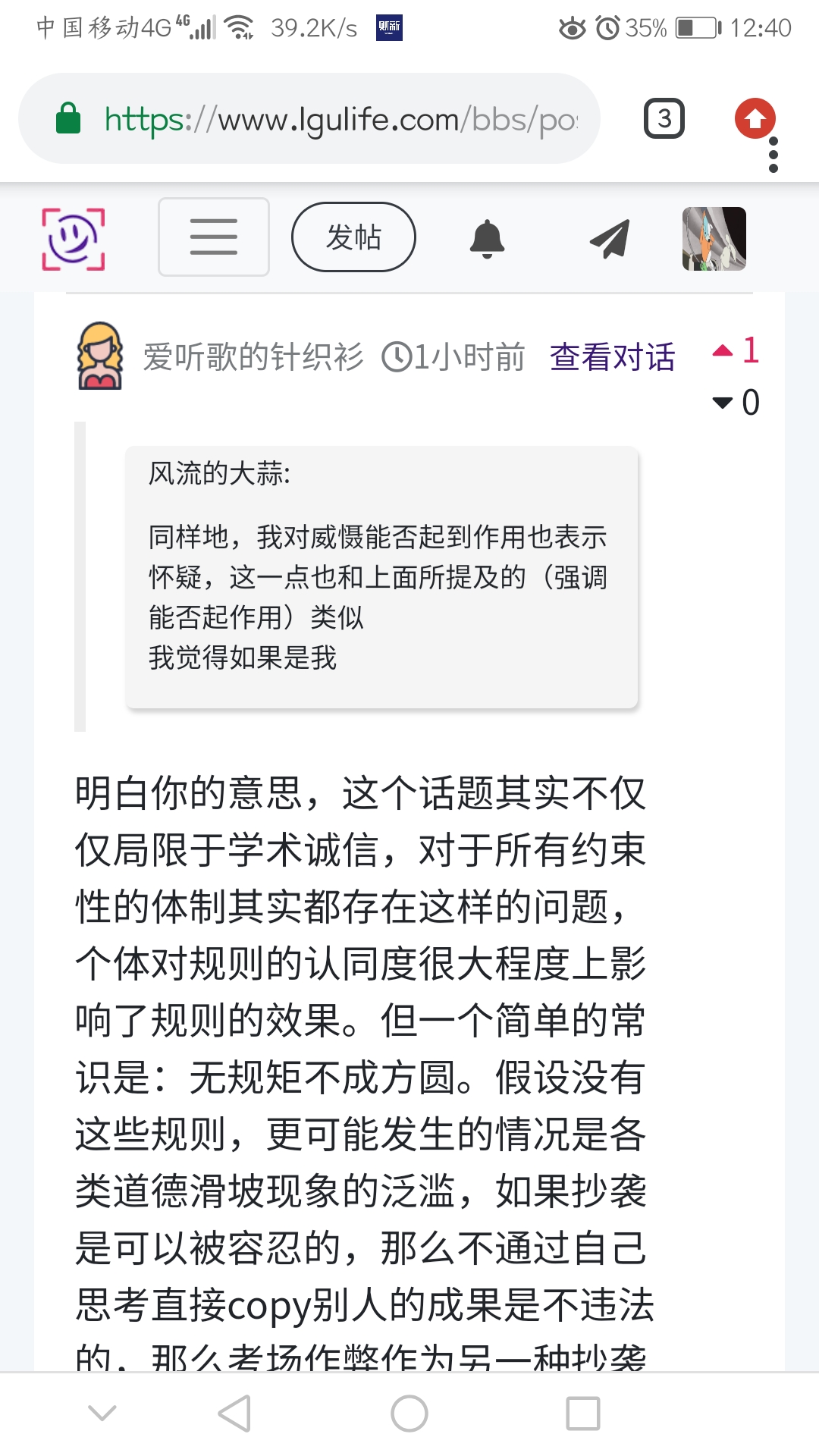 明白你的意思,这个话题其实不仅仅局限于学术诚信,对于所有约束性的体制其实都存在这样的问题,个体对规则的认同度很大程度上影响了规则的效果。但一个简单的常识是:无规矩不成方圆。假设没有这些规则,更可能发生的情况是各类道德滑坡现象的泛滥,如果抄袭是可以被容忍的,那么不通过自己思考直接copy别人的成果是不违法的,那么考场作弊作为另一种抄袭(同样是剽窃他人的思考),是不是也可以被容忍?如果犯罪分子打砸抢之后不需要承担相应的惩罚,那么有意识地做其他“犯罪”的行为是不是也不需要承担后果?