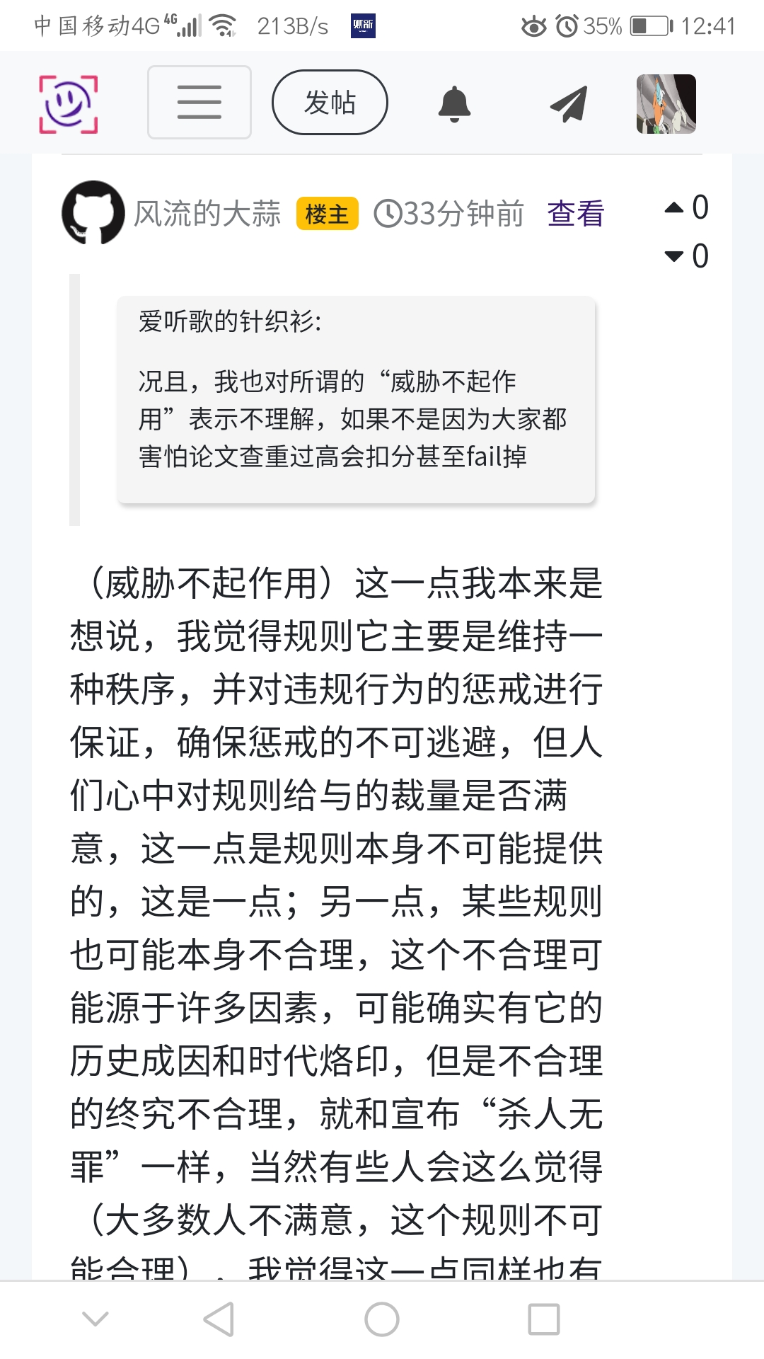 (威胁不起作用)这一点我本来是想说,我觉得规则它主要是维持一种秩序,并对违规行为的惩戒进行保证,确保惩戒的不可逃避,但人们心中对规则给与的裁量是否满意,这一点是规则本身不可能提供的,这是一点;另一点,某些规则也可能本身不合理,这个不合理可能源于许多因素,可能确实有它的历史成因和时代烙印,但是不合理的终究不合理,就和宣布“杀人无罪”一样,当然有些人会这么觉得(大多数人不满意,这个规则不可能合理),我觉得这一点同样也有待商榷