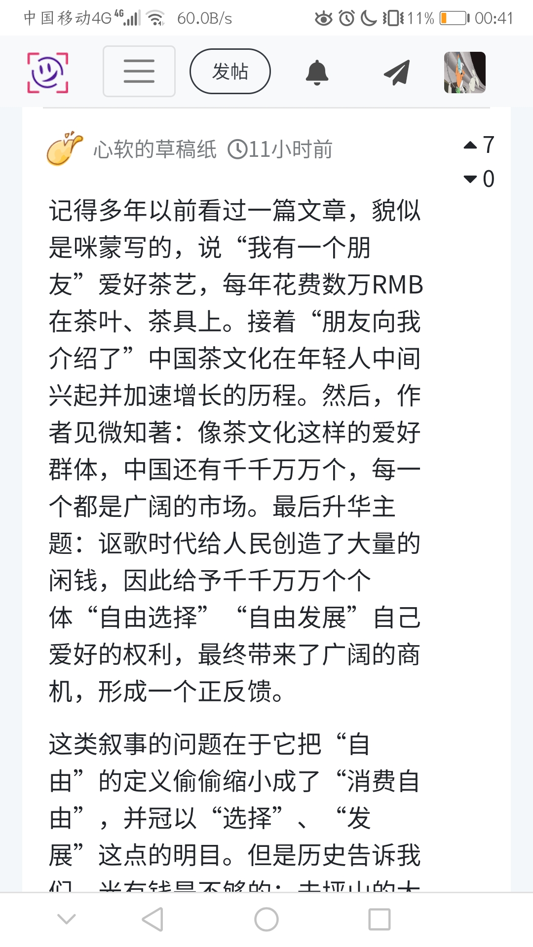 记得多年以前看过一篇文章,貌似是咪蒙写的,说“我有一个朋友”爱好茶艺,每年花费数万RMB在茶叶、茶具上。接着“朋友向我介绍了”中国茶文化在年轻人中间兴起并加速增长的历程。然后,作者见微知著:像茶文化这样的爱好群体,中国还有千千万万个,每一个都是广阔的市场。最后升华主题:讴歌时代给人民创造了大量的闲钱,因此给予千千万万个个体“自由选择”“自由发展”自己爱好的权利,最终带来了广阔的商机,形成一个正反馈。