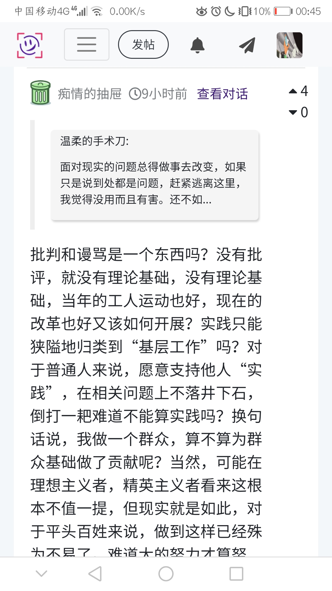 批判和谩骂是一个东西吗?没有批评,就没有理论基础,没有理论基础,当年的工人运动也好,现在的改革也好又该如何开展?实践只能狭隘地归类到“基层工作”吗?对于普通人来说,愿意支持他人“实践”,在相关问题上不落井下石,倒打一耙难道不能算实践吗?换句话说,我做一个群众,算不算为群众基础做了贡献呢?当然,可能在理想主义者,精英主义者看来这根本不值一提,但现实就是如此,对于平头百姓来说,做到这样已经殊为不易了。难道大的努力才算努力,小的努力就不算努力了吗?