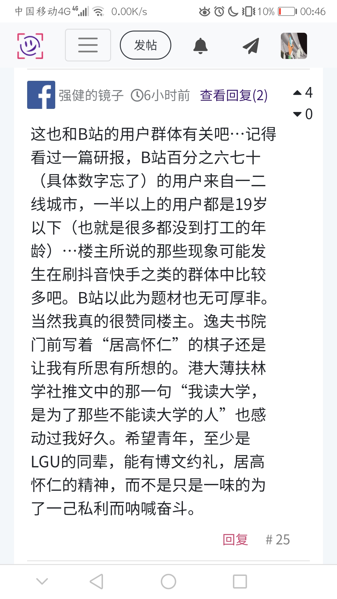这也和B站的用户群体有关吧…记得看过一篇研报,B站百分之六七十(具体数字忘了)的用户来自一二线城市,一半以上的用户都是19岁以下(也就是很多都没到打工的年龄)…楼主所说的那些现象可能发生在刷抖音快手之类的群体中比较多吧。B站以此为题材也无可厚非。当然我真的很赞同楼主。逸夫书院门前写着“居高怀仁”的棋子还是让我有所思有所想的。港大薄扶林学社推文中的那一句“我读大学,是为了那些不能读大学的人”也感动过我好久。希望青年,至少是LGU的同辈,能有博文约礼,居高怀仁的精神,而不是只是一味的为了一己私利而呐喊奋斗。