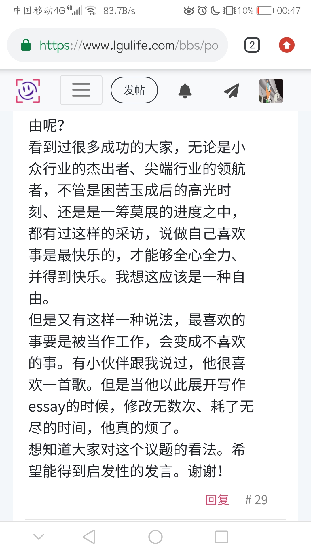 但是又有这样一种说法,最喜欢的事要是被当作工作,会变成不喜欢的事。有小伙伴跟我说过,他很喜欢一首歌。但是当他以此展开写作essay的时候,修改无数次、耗了无尽的时间,他真的烦了。