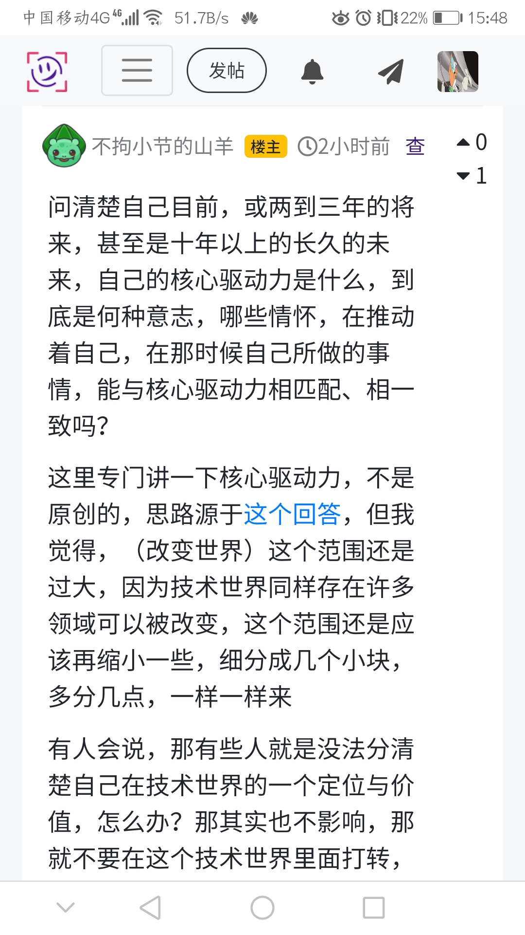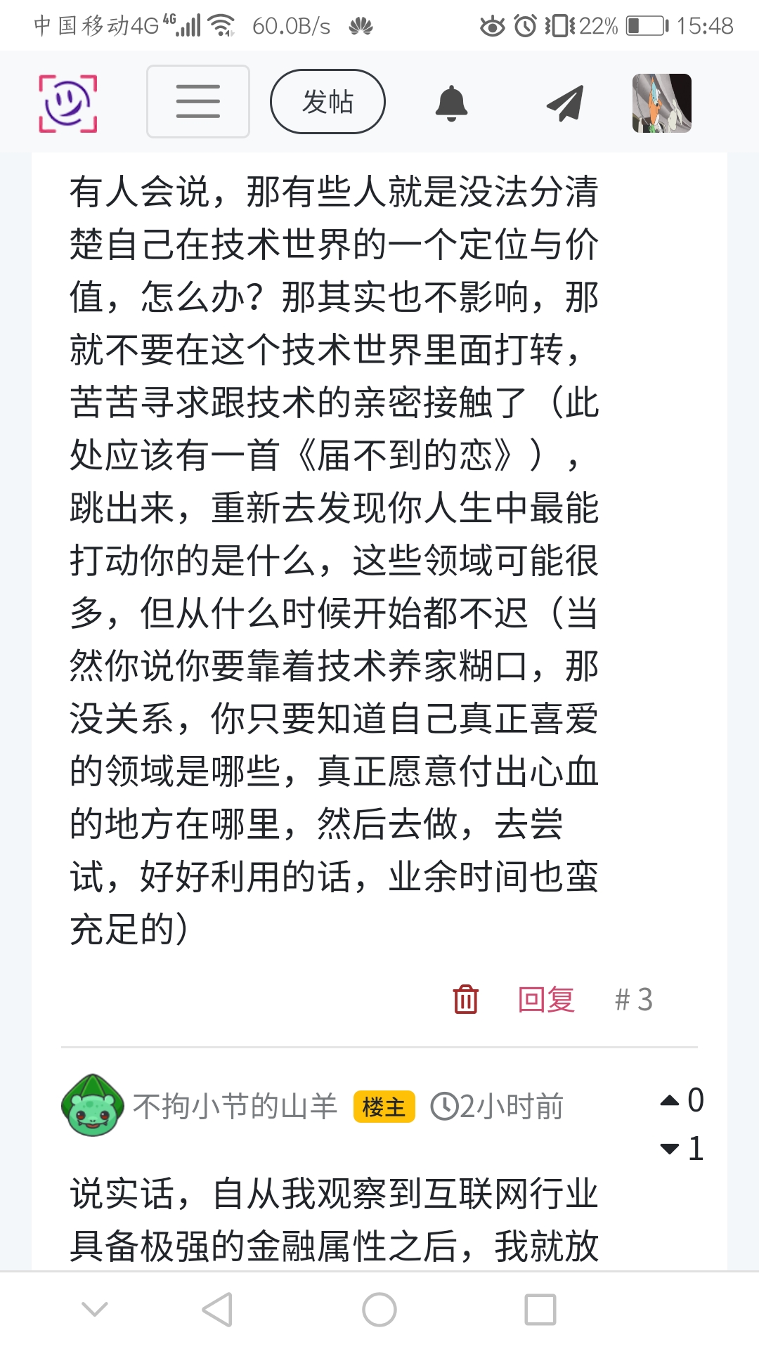 有人会说,那有些人就是没法分清楚自己在技术世界的一个定位与价值,怎么办?那其实也不影响,那就不要在这个技术世界里面打转,苦苦寻求跟技术的亲密接触了(此处应该有一首《届不到的恋》),跳出来,重新去发现你人生中最能打动你的是什么,这些领域可能很多,但从什么时候开始都不迟(当然你说你要靠着技术养家糊口,那没关系,你只要知道自己真正喜爱的领域是哪些,真正愿意付出心血的地方在哪里,然后去做,去尝试,好好利用的话,业余时间也蛮充足的)