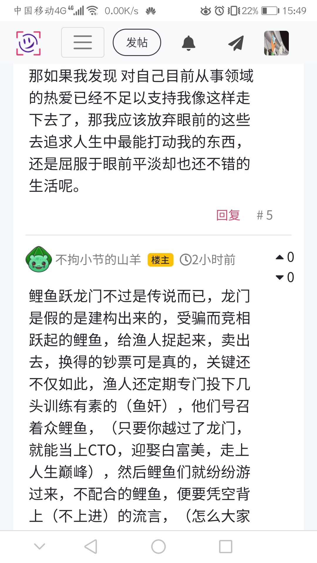 鲤鱼跃龙门不过是传说而已,龙门是假的是建构出来的,受骗而竞相跃起的鲤鱼,给渔人捉起来,卖出去,换得的钞票可是真的,关键还不仅如此,渔人还定期专门投下几头训练有素的(鱼奸),他们号召着众鲤鱼,(只要你越过了龙门,就能当上CTO,迎娶白富美,走上人生巅峰),然后鲤鱼们就纷纷游过来,不配合的鲤鱼,便要凭空背上(不上进)的流言,(怎么大家都在跳,就你不跳…)