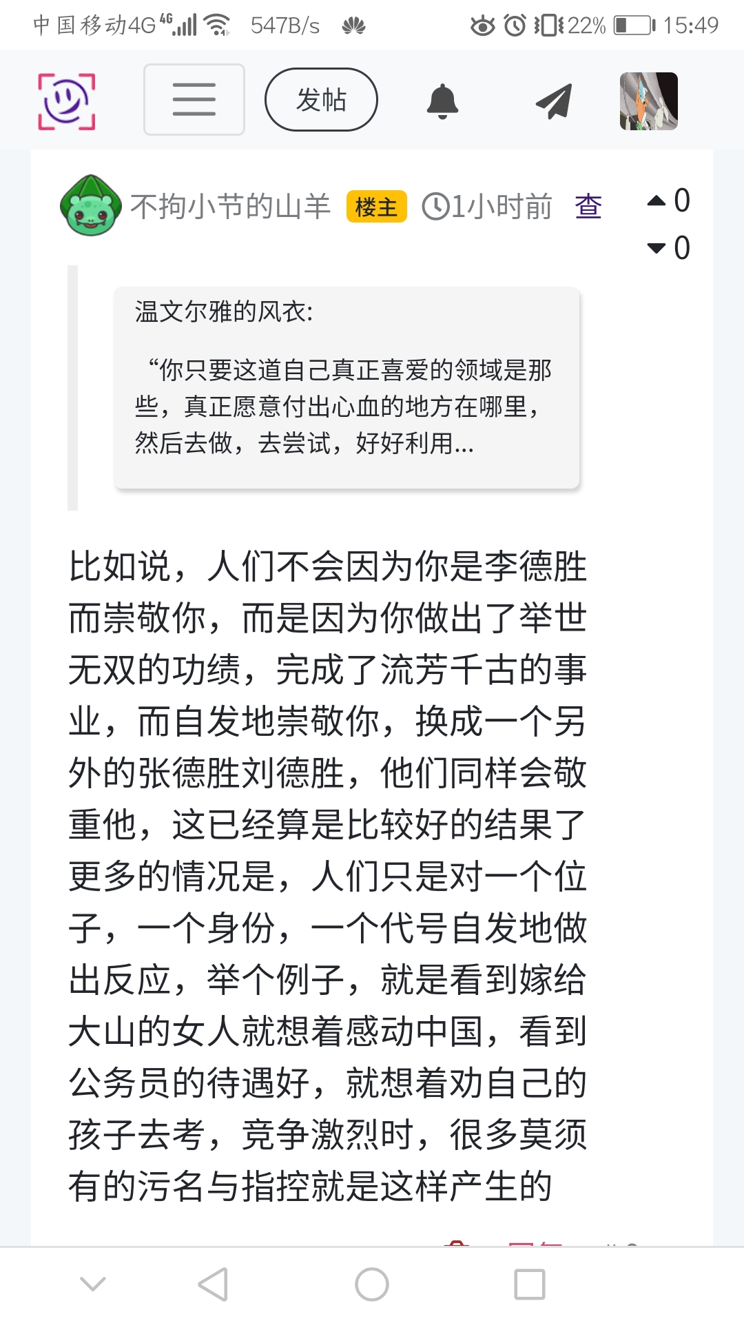 更多的情况是,人们只是对一个位子,一个身份,一个代号自发地做出反应,举个例子,就是看到嫁给大山的女人就想着感动中国,看到公务员的待遇好,就想着劝自己的孩子去考,竞争激烈时,很多莫须有的污名与指控就是这样产生的