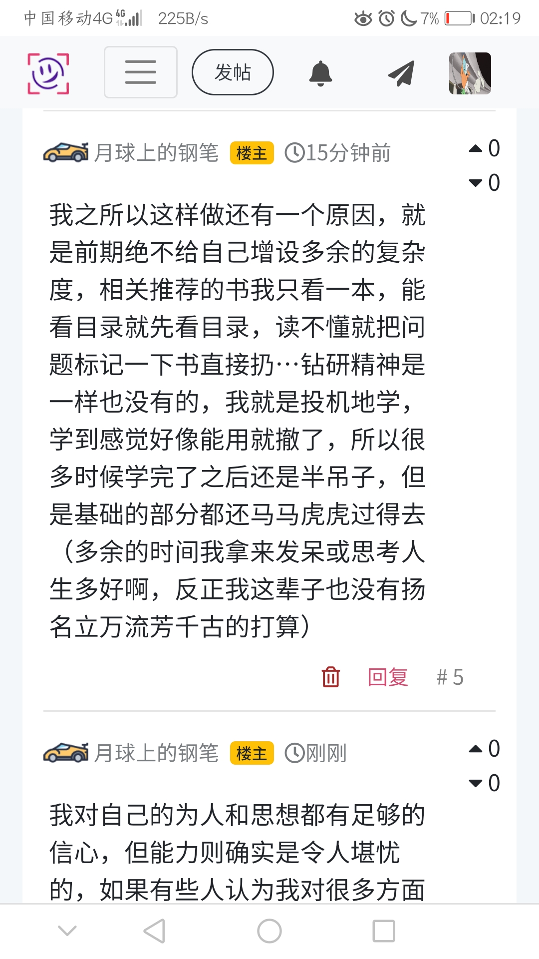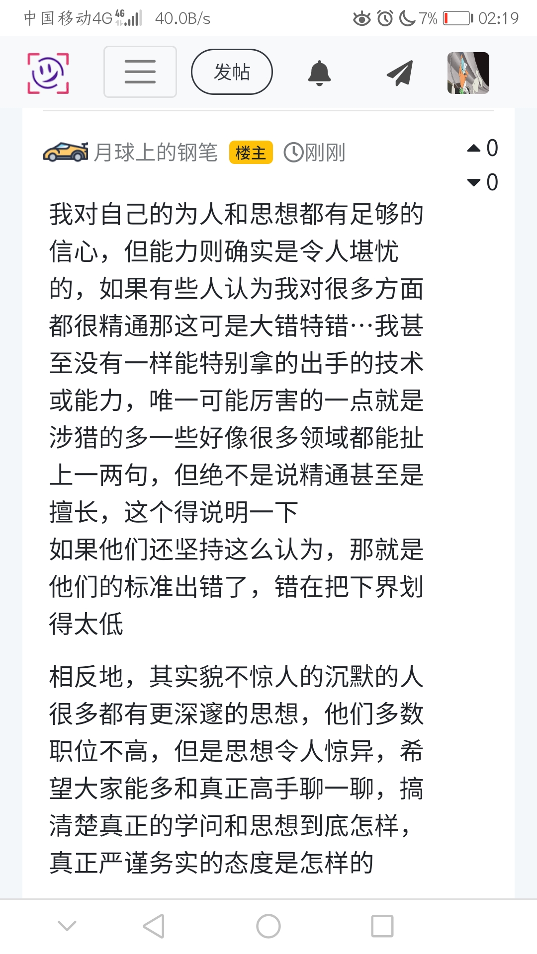 我对自己的为人和思想都有足够的信心,但能力则确实是令人堪忧的,如果有些人认为我对很多方面都很精通那这可是大错特错…我甚至没有一样能特别拿的出手的技术或能力,唯一可能厉害的一点就是涉猎的多一些好像很多领域都能扯上一两句,但绝不是说精通甚至是擅长,这个得说明一下