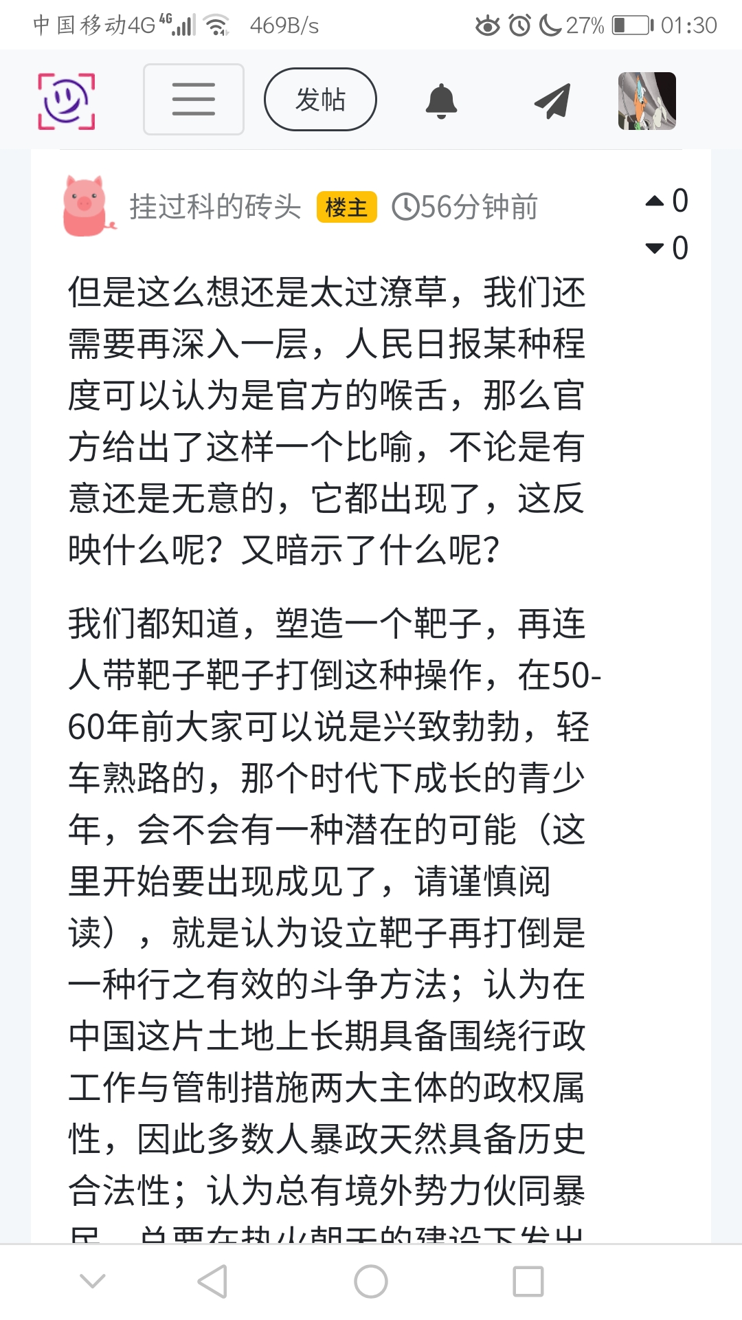 我们都知道,塑造一个靶子,再连人带靶子靶子打倒这种操作,在50-60年前大家可以说是兴致勃勃,轻车熟路的,那个时代下成长的青少年,会不会有一种潜在的可能(这里开始要出现成见了,请谨慎阅读),就是认为设立靶子再打倒是一种行之有效的斗争方法;认为在中国这片土地上长期具备围绕行政工作与管制措施两大主体的政权属性,因此多数人暴政天然具备历史合法性;认为总有境外势力伙同暴民,总要在热火朝天的建设下发出不和谐音,总会煽妖风,点鬼火,作狐鸣